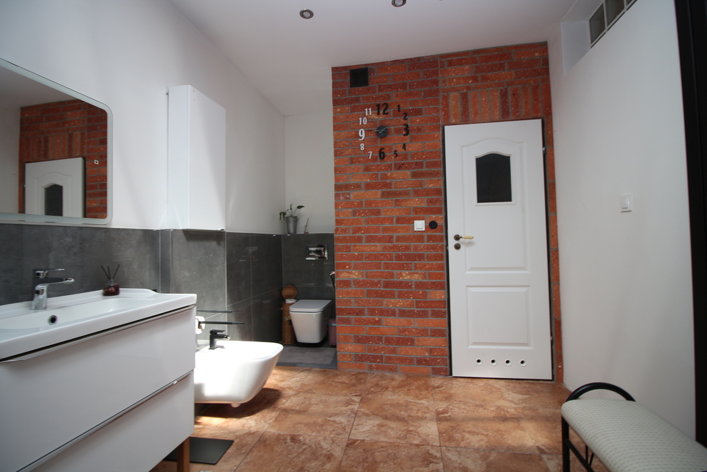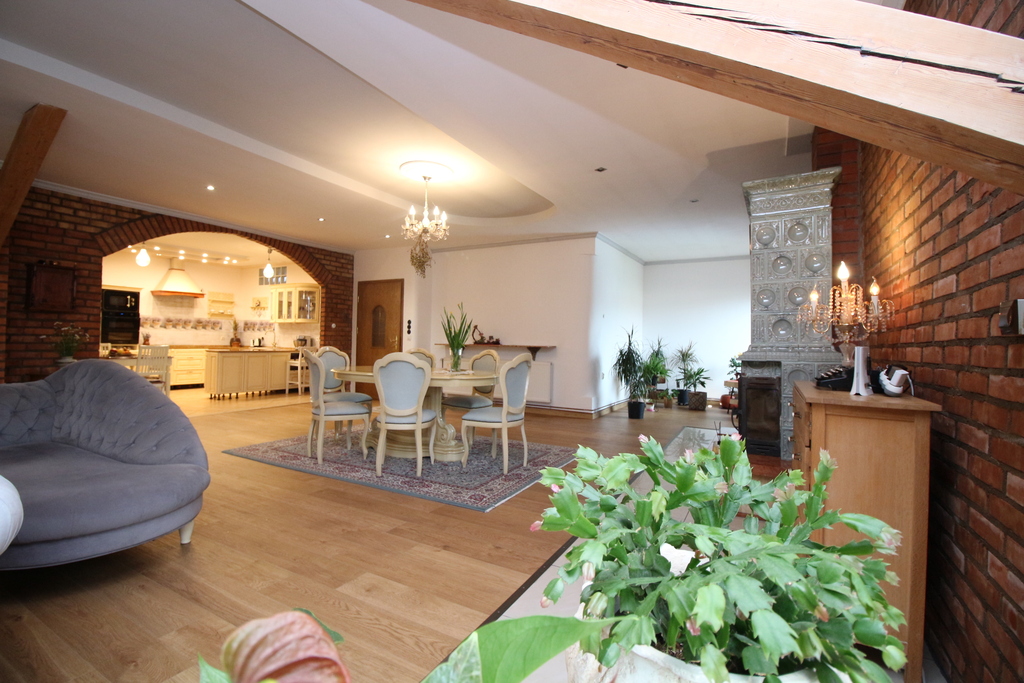 Wnętrza łączą surowy urok cegły i drewnianych belek z funkcjonalnością i elegancją – tworząc spójną, przytulną całość.