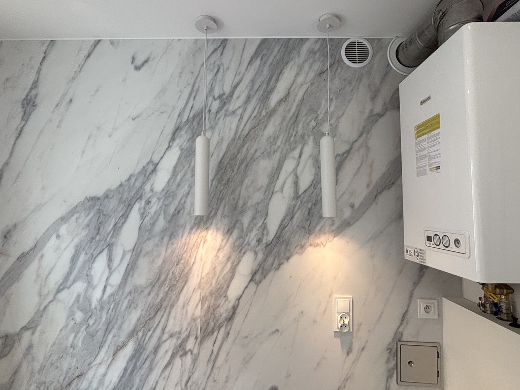 Na podłogach panele wysokiej klasy - w łazience płyta węglowa imitująca marmur, ściany gładzone, malowane.