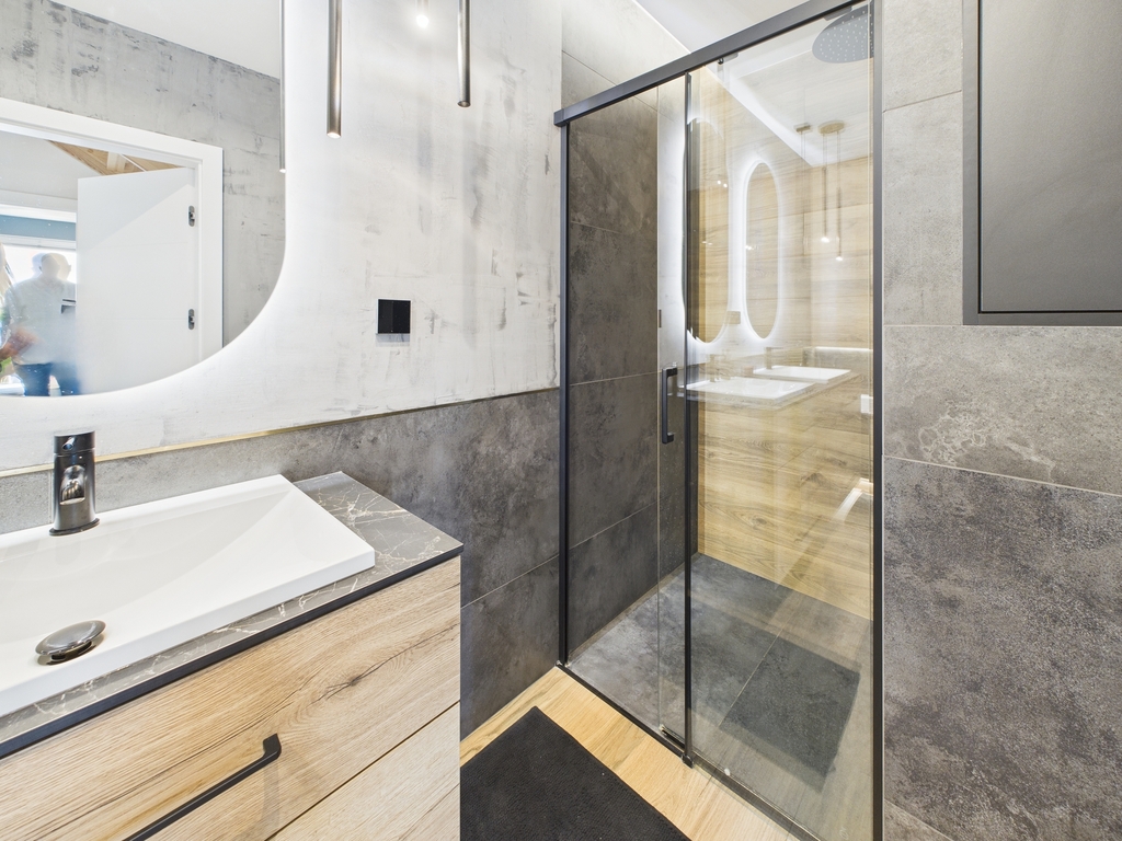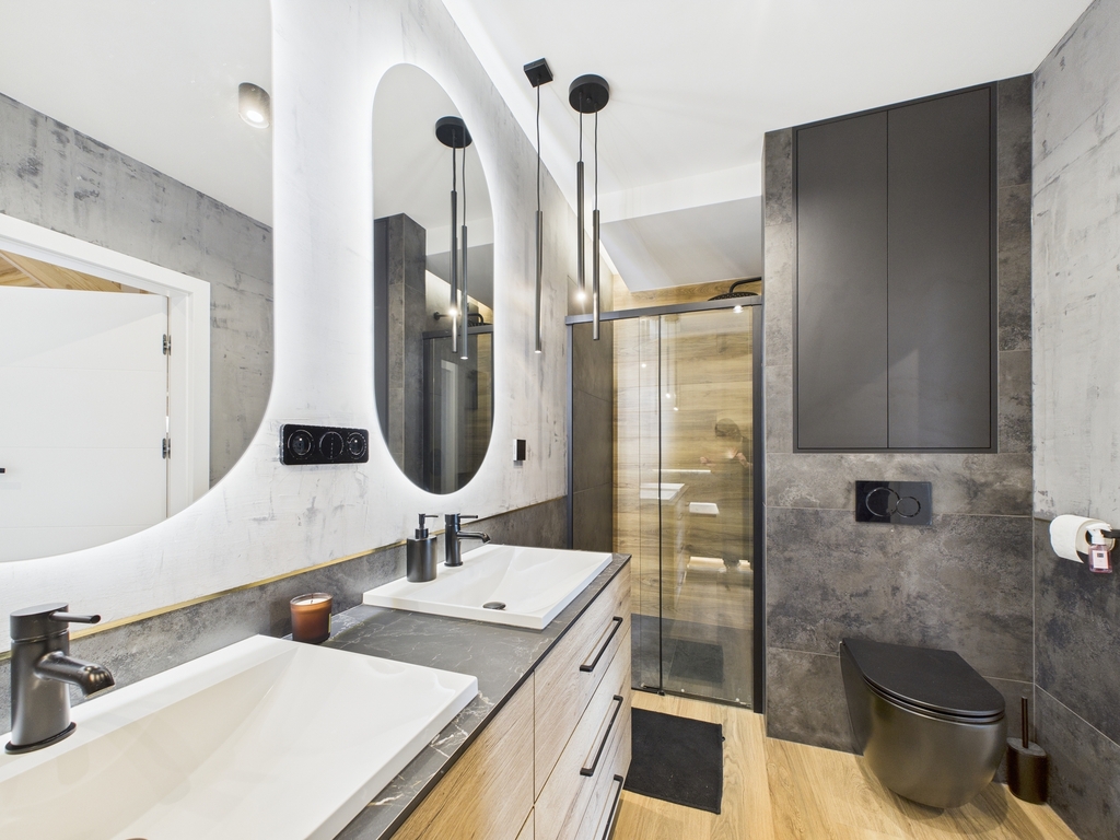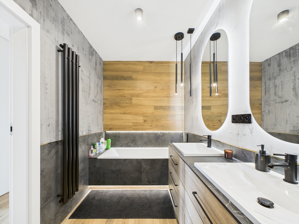 - Podłogi: panele w pokojach, płytki w łazienkach