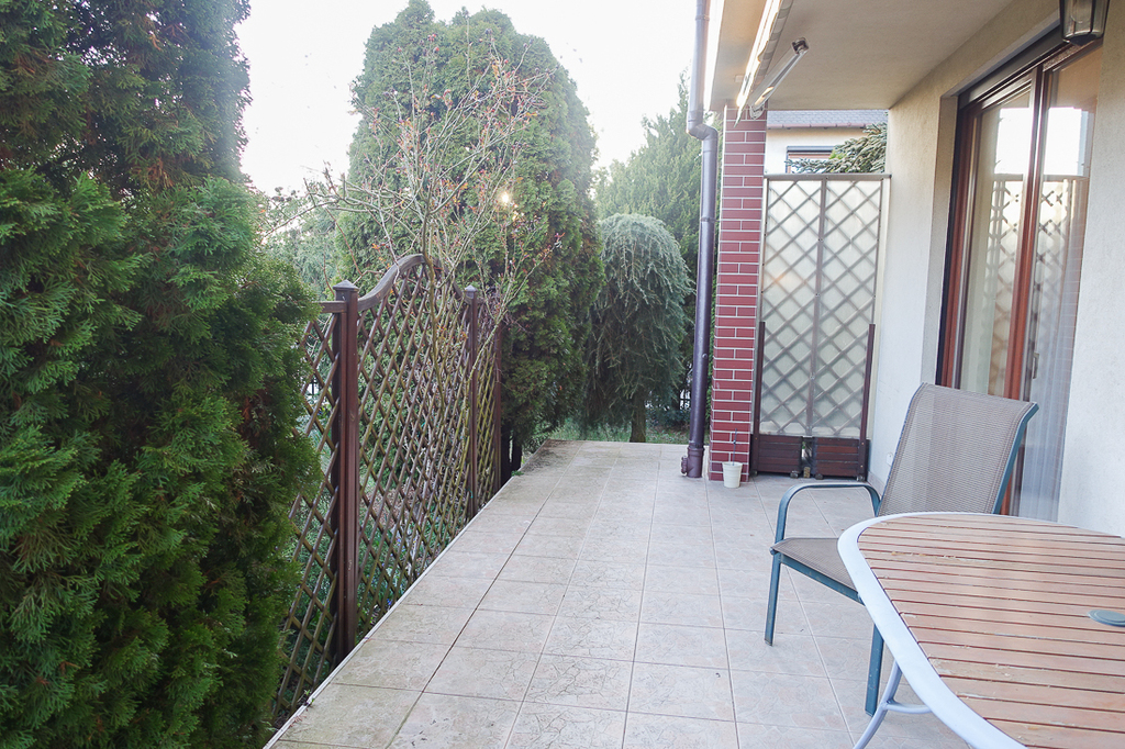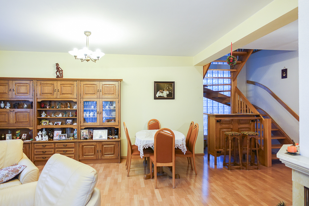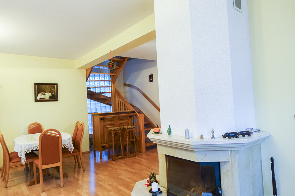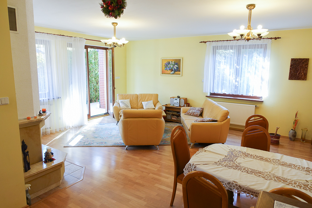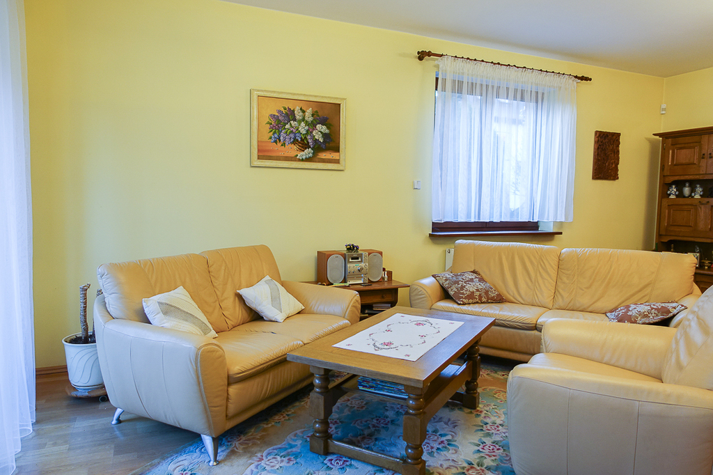 For sale in a cozy location in Gumieńce on a very quiet street among greenery, a detached house from 2000, very comfortable and functional. Entrance to the building from the zero level. Usable area 189.5 m2 (more on the floor), plot 492 m2, surrounded by single-family and terraced houses. Ground floor, first floor with small sloping ceilings, unusable attic, low. No basement. Built-in garage for 1 car. Ground floor: living room, kitchen, toilet, 2 utility rooms and garage. First floor 3 rooms, wardrobe, bathroom, utility room and hall (an additional room can be separated). GROUND FLOOR: living room 32 m2 with fireplace and exit through double doors to the terrace of about 16 m2 and further to the garden with trees and shrubs. Living room open to the hall 10.5 m2. From the hall entrance to a separate kitchen 13.5 m2 with a window. In the square-shaped kitchen there is built-in furniture with household appliances (a 60 cm WHIRPOOL dishwasher, an electric cooker with a ceramic hob and an AMICA oven, a hood, a table with chairs. From the hall there is an entrance to the toilet with a 2.6 m2 washbasin and to the technical rooms - a laundry room with a bathtub and a washing machine with an area of 10.5 m2, in this room there is also a BUDERUS gas boiler (replaced 3 years ago) and a 118 l hot water tank. Then there is a passage to the 5.2 m2 pantry with an additional fridge and then the entrance to the garage with an area of 19.2 m2. Entrance to the house through a 2.4 m2 vestibule, terracotta flooring. FIRST FLOOR: bedroom 24.5 m2 (27.3 m2 on the floor) with an entrance to the wardrobe with a 9 m2 skylight (11.5 m2 on the floor), additional rooms with an area of 16 m2 (16 m2 on the floor) floor 20.4 m2) and 9.5 m2 (12.7 m2 on the floor), lounge 18.5 m2 (20 m2 on the floor) with a roof window, bathroom 11.1 m2 (13.5 m2 on the floor) with a bathtub, washbasin, toilet and bidet, there is a possibility of installing a shower cabin, roof window in the bathroom. In addition, a small wardrobe with slopes without a window. On the first floor, apart from the bathroom, wardrobe and hall, there are full-size windows. From the hall, a staircase leading down from the top leads to the attic with windows, 3 storage rooms in it. The roof is insulated, and the ceiling above the first floor is also insulated. The height at the highest point is 2.65 m. The house is built of blocks, a steep roof with metal roof tiles, gas heating, anti-burglary entrance door, anti-burglary roller shutters on the entire ground floor controlled by remote control, monitoring. Modern wooden VELUX windows, double glazed, partially roof-mounted on the first floor, wooden window sills. Knee walls on the first floor, 1.3 m high. In the bathroom and toilets, tiles and terracotta. In the technical rooms, terracotta. The plot is fenced with a remote-controlled gate. Garage doors, tilting, remote-controlled. Possibility of leaving furniture or
