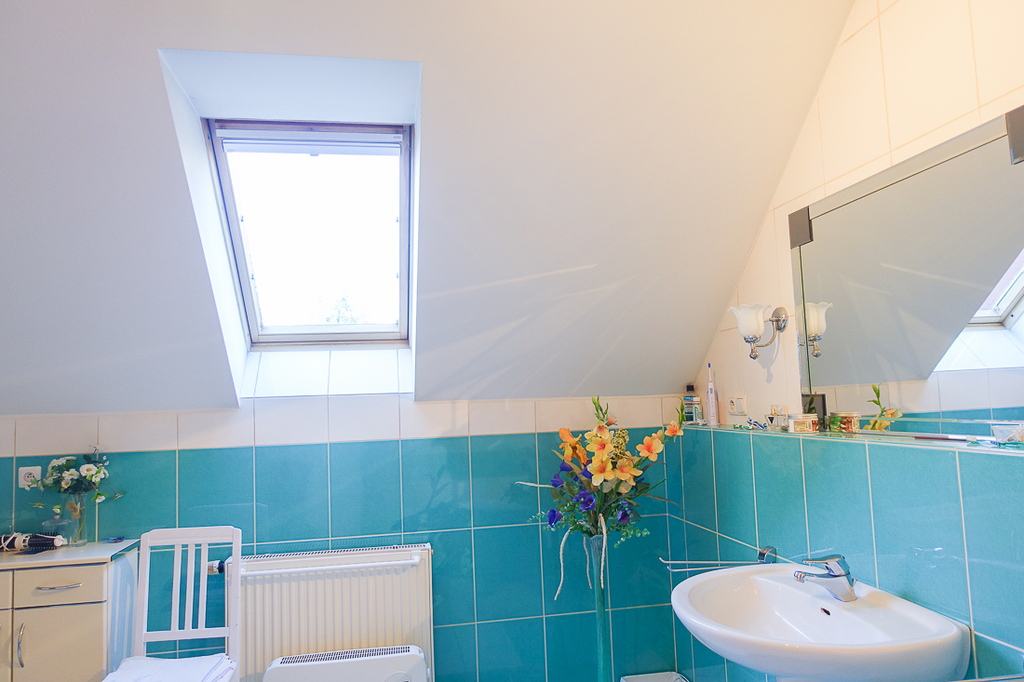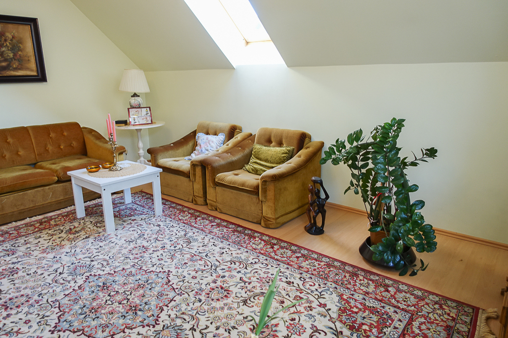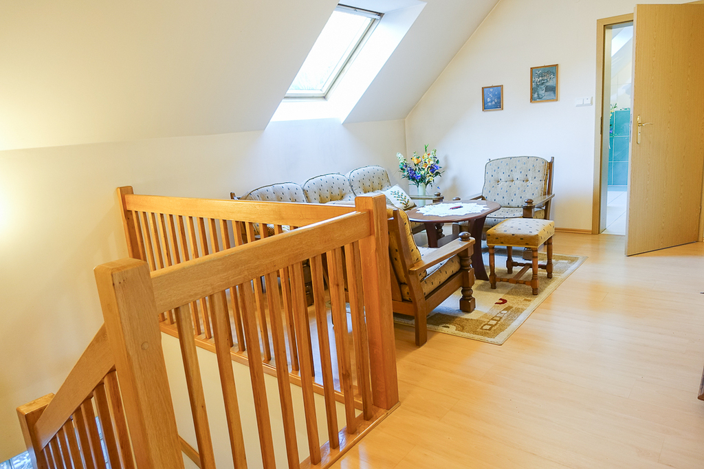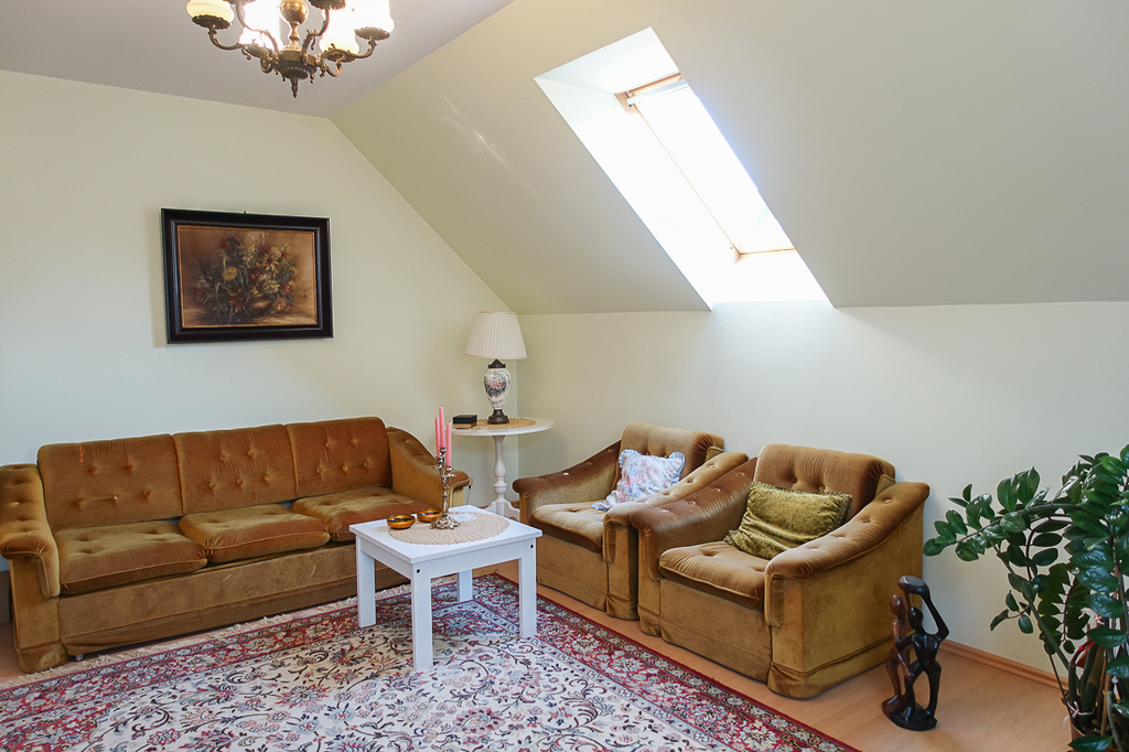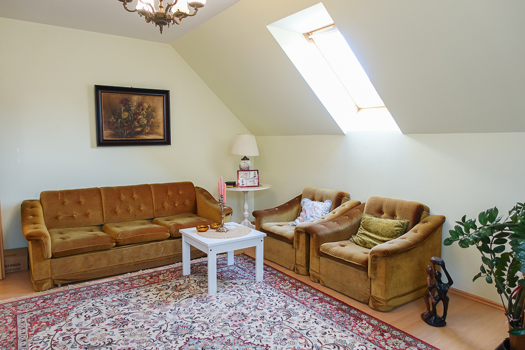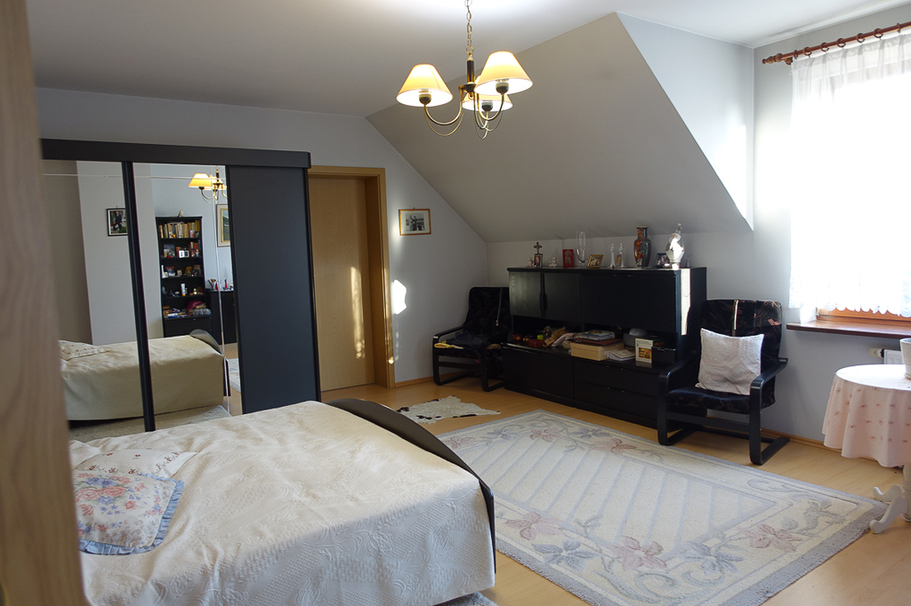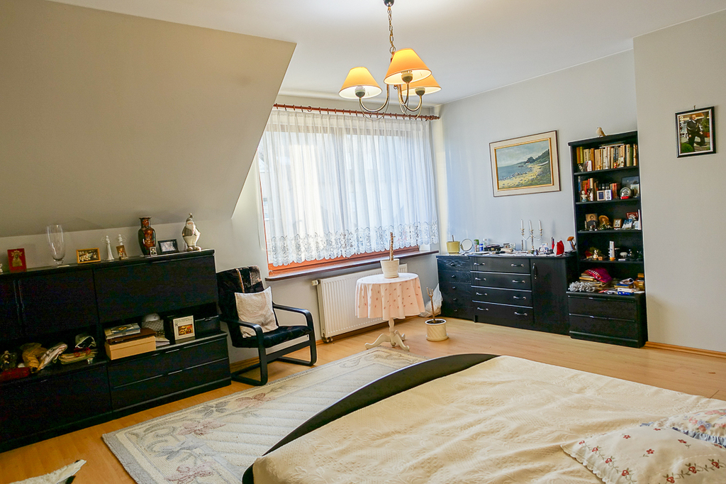 PIĘTRO: sypialnia 24,5 m2 (po podłodze 27,3 m2) z wejściem do garderoby z oknem połaciowym o powierzchni 9 m2 (po podłodze 11,5 m2), ponadto pokoje o powierzchni 16 m2 (po podłodze 20,4 m2) i 9,5 m2 (po podłodze 12,7 m2), hall wypoczynkowy 18,5 m2 (po podłodze 20 m2) z oknem połaci owym, łazienka o powierzchni 11,1 m2 (po podłodze 13,5 m2) z wanną, umywalką, WC i bidetem, jest możliwość zainstalowania kabiny prysznicowej, w łazience okno połaciowe. Ponadto mała garderoba ze skosami bez okna. Na piętrze poza łazienką, garderobą hallem okna są pełnowymiarowe. Z hallu opuszczanymi z góry schodami wejście na strych z oknami w nim 3 pomieszczenia do przechowywania. Dach ocieplony, ponadto strop nad I piętrem ocieplony. Wysokość w najwyższym punkcie 2,65 m.