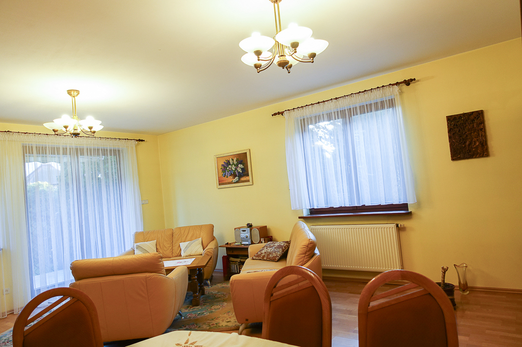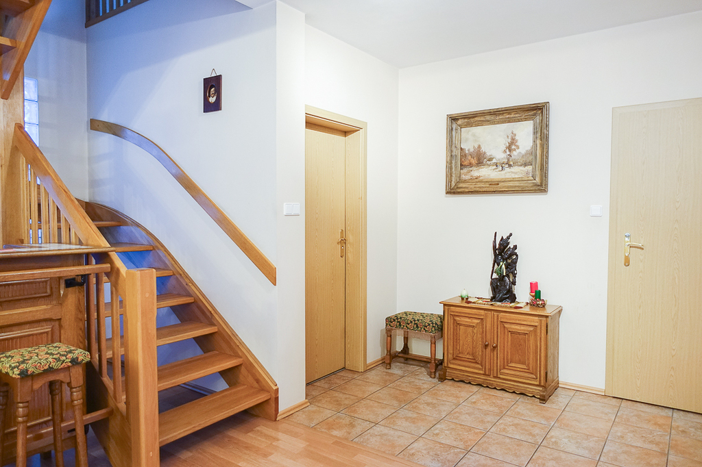 PARTER: salon 32 m2 z kominkiem i wyjściem podwójnymi drzwiami na taras o powierzchni około 16 m2 i dalej do ogrodu z drzewami i krzewami. Salon otwarty na hall 10,5 m2. Z hallu wejście do oddzielnej kuchni 13,5 m2 z oknem. W kuchni o kształcie kwadratu zabudowa meblowa z urządzeniami AGD (zmywarka 60 cm WHIRPOOL, kuchenka elektryczna z płytą ceramiczną i piekarnikiem AMICA, okap), stół z krzesłami. Z hallu wejście do WC z umywalką 2,6 m2 oraz do pomieszczeń technicznych - pralni z wanną i pralką o powierzchni 10,5 m2, w tym pomieszczeniu też piec gazowy BUDERUS (wymieniony 3 lata temu) oraz z zbiornik na ciepłą wodę 118 l. Dalej przejście do spiżarni 5,2 m2 w niej dodatkowa lodówka i dalej wejście do garażu o powierzchni 19,2 m2. Wejście do domu przez wiatrołap o powierzchni 2,4 m2, na podłodze terakota.