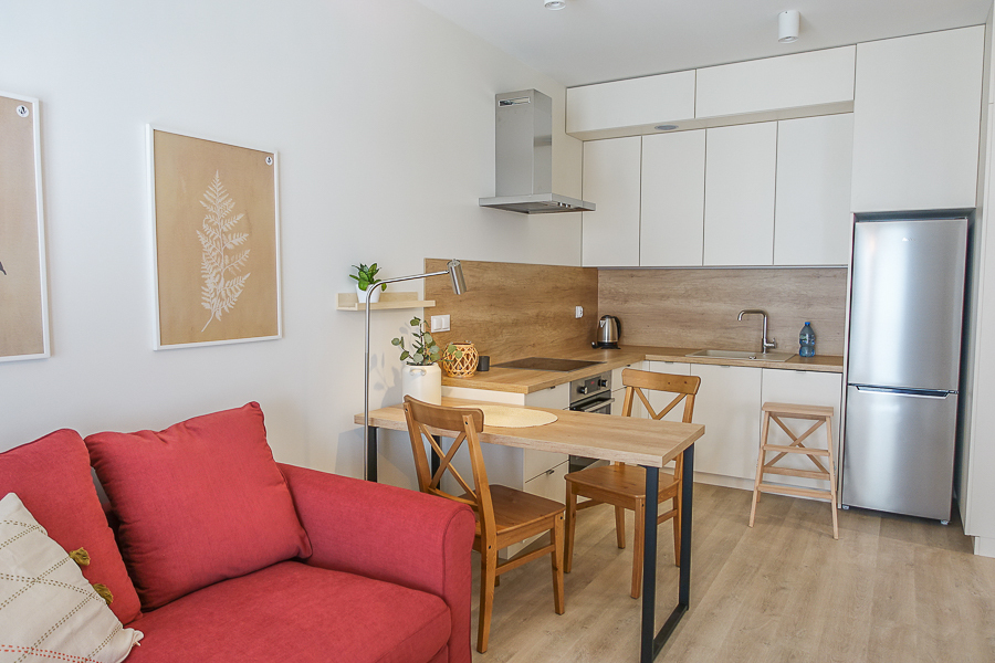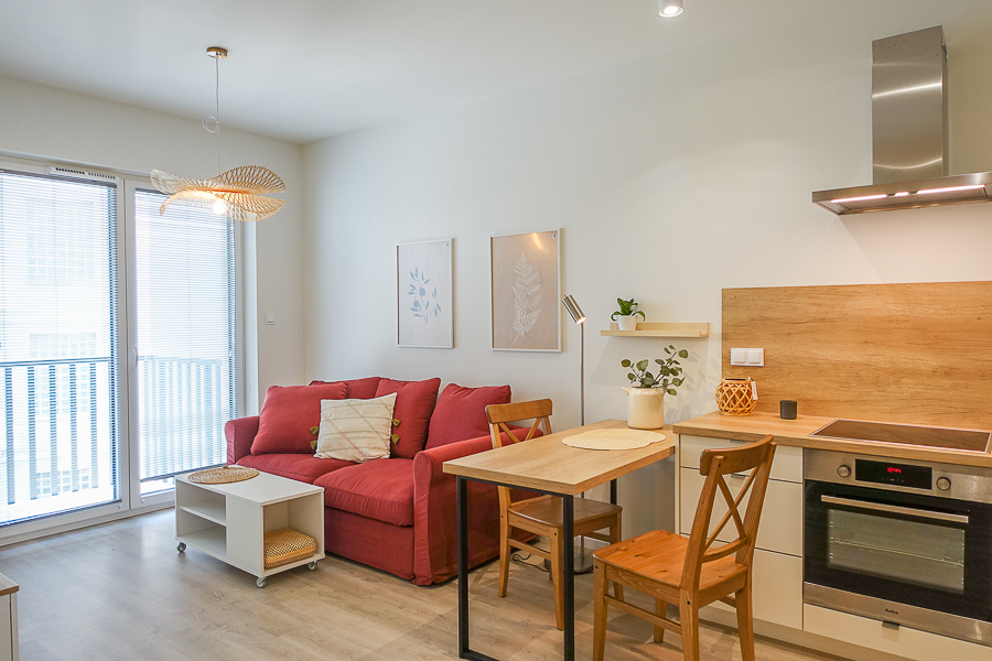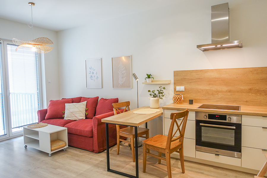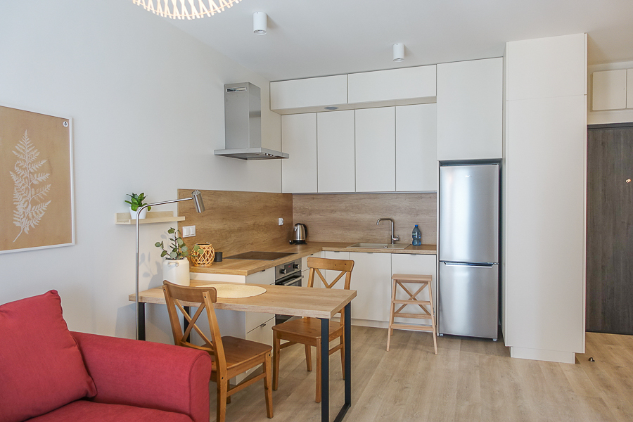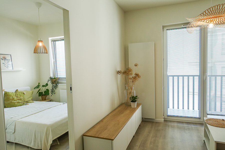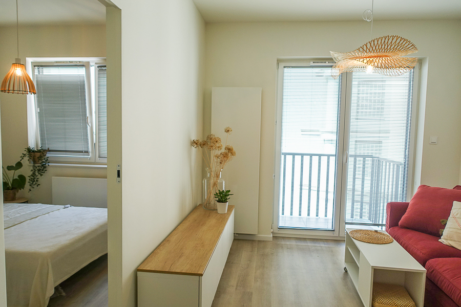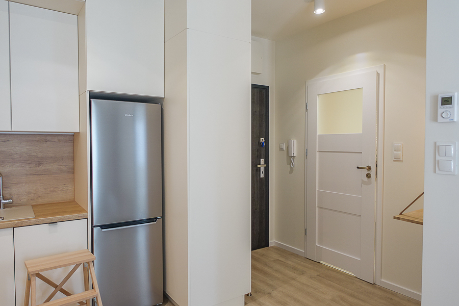 Available from June 7, 2025 for rent an elegant 2-room apartment for a couple or a single in the newly built in 2021 apartment building KAMIENICA NOVA III at Narutowicza street, with two silent elevators, furnished and equipped. Freshly finished and fully furnished. Room with kitchenette of 18 m2, bedroom 8.5 m2, hall 2.66 m2, bathroom 3.49 m2, west-facing balcony 2.48 m2 with lighting. AVERAGE MONTHLY COSTS ARE APPROX. PLN 800, INCLUDING ALL COSTS: RENT TO THE MANAGER, HEATING, WATER, ELECTRICITY AND GARBAGE REMOVAL. Fully equipped kitchenette: fridge with freezer, hood, ceramic hob, oven, dishwasher. In the room: table, 2 chairs, coffee table on wheels, TV table, sofa bed, in the bedroom: two-door wardrobe, double bed 1.40 m wide, chest of drawers with drawers, tables, shelf, in the hall: two-door wardrobe, shelf, mirror. In the bathroom: washing machine, washbasin, cabinet, shower cubicle without shower tray with linear drain, ceramic tiles. All equipment under warranty. Blinds in the windows. Possibility of connecting cable TV and the Internet. Cost PLN 2,500, additional rent to the manager, PLN 367.66 plus electricity approx. PLN 150 per month, water and heating from SEC PLN 177 on average per month, cold water PLN 120 on average. Heating and water heating from the city. Deposit PLN 4,000. Offer for a couple or a single person. The apartment is not suitable for children or animals. Occasional lease with the third party indicating the apartment to which the tenant will move after the lease ends or a contract for a company.