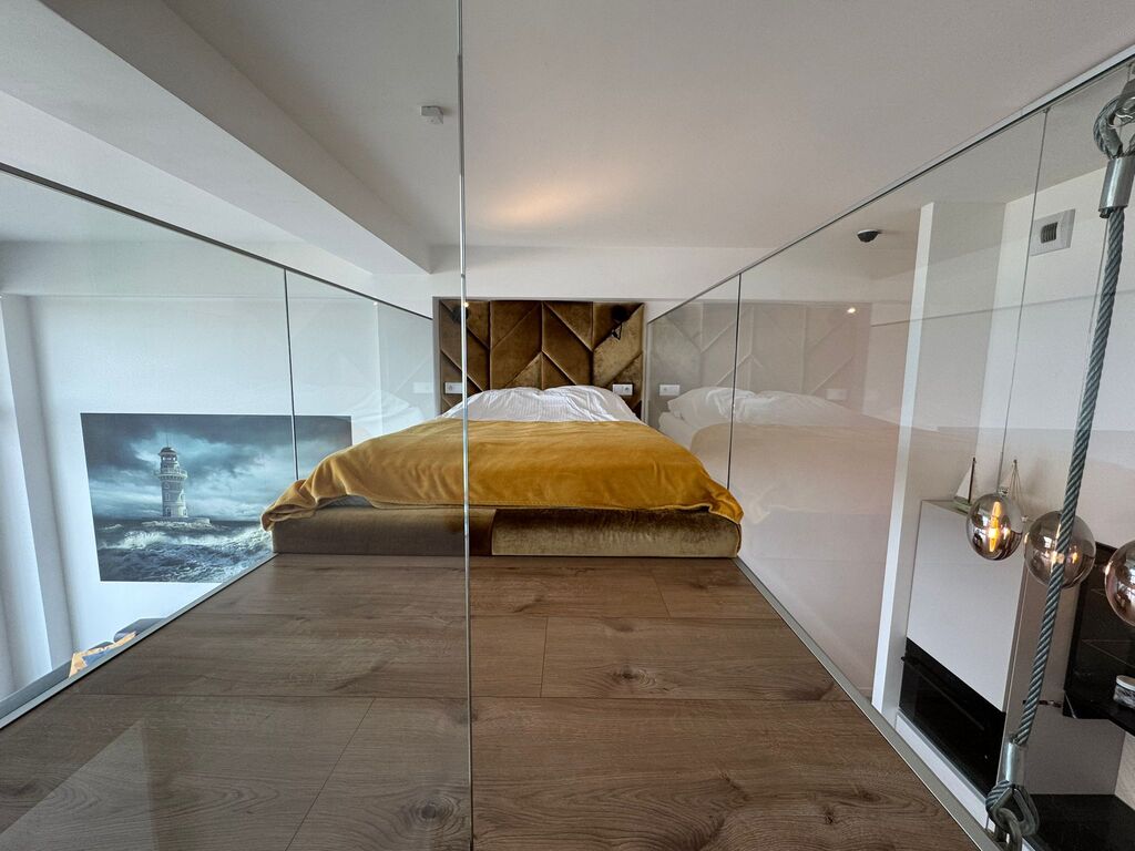 Wnętrze zostało zaprojektowane z dbałością o komfort i estetykę. Ogromne przeszklenia zapewniają naturalne doświetlenie i niezakłócony widok na horyzont. Antresola dodaje przestrzeni i charakteru, tworząc przytulną strefę wypoczynku.