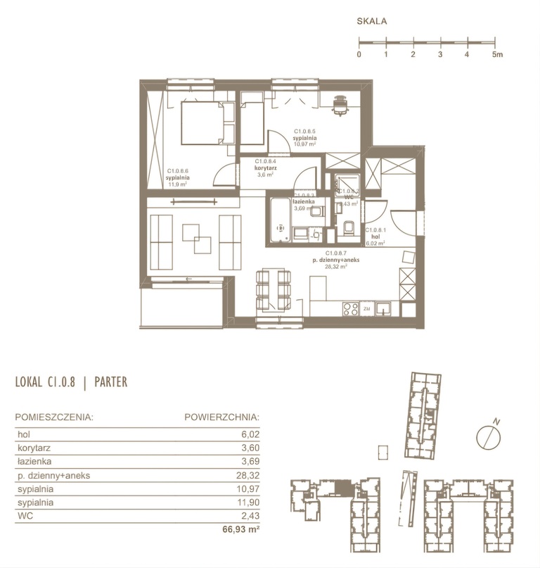 - Układ pomieszczeń: salon z aneksem kuchennym z wyjściem na ogród, dwie sypialnie, łazienka, wc, hol, korytarz.