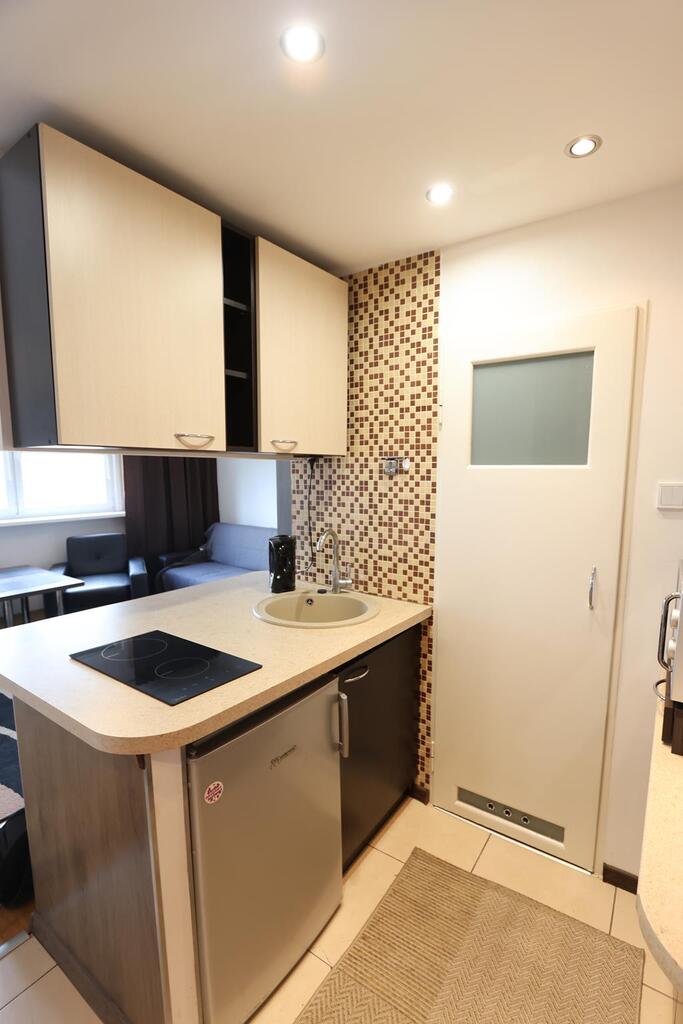 - kuchnia - meble kuchenne, płyta grzewcza, zlewozmywak, mała lodówka,