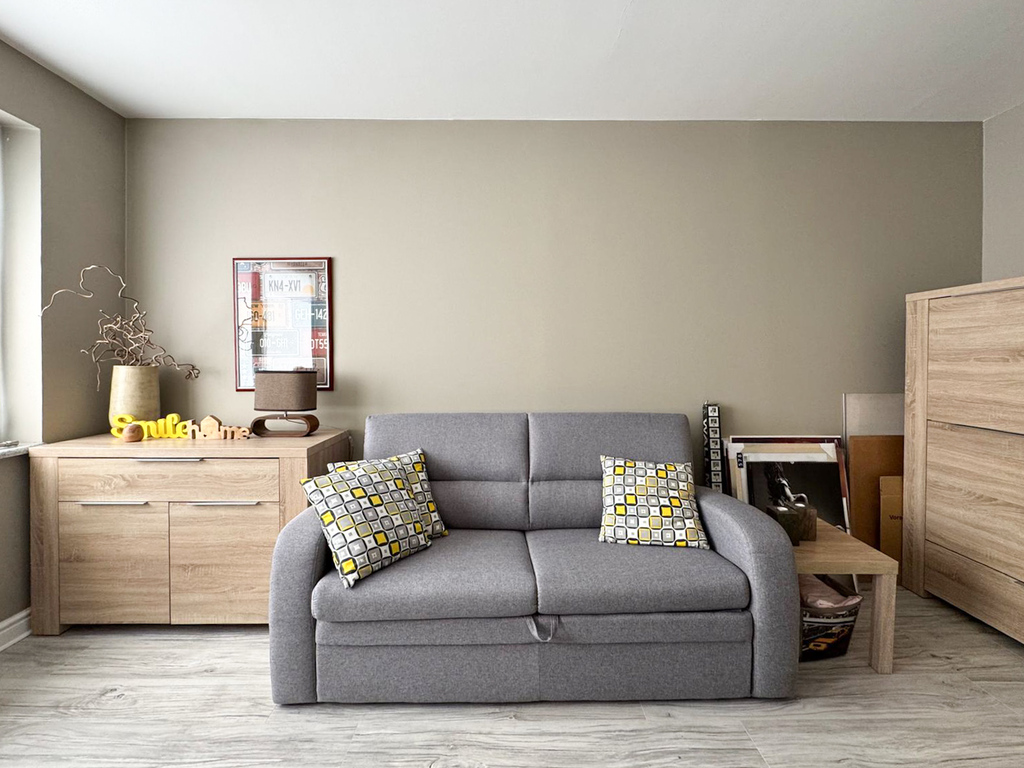 - przestronny salon z aneksem kuchennym,