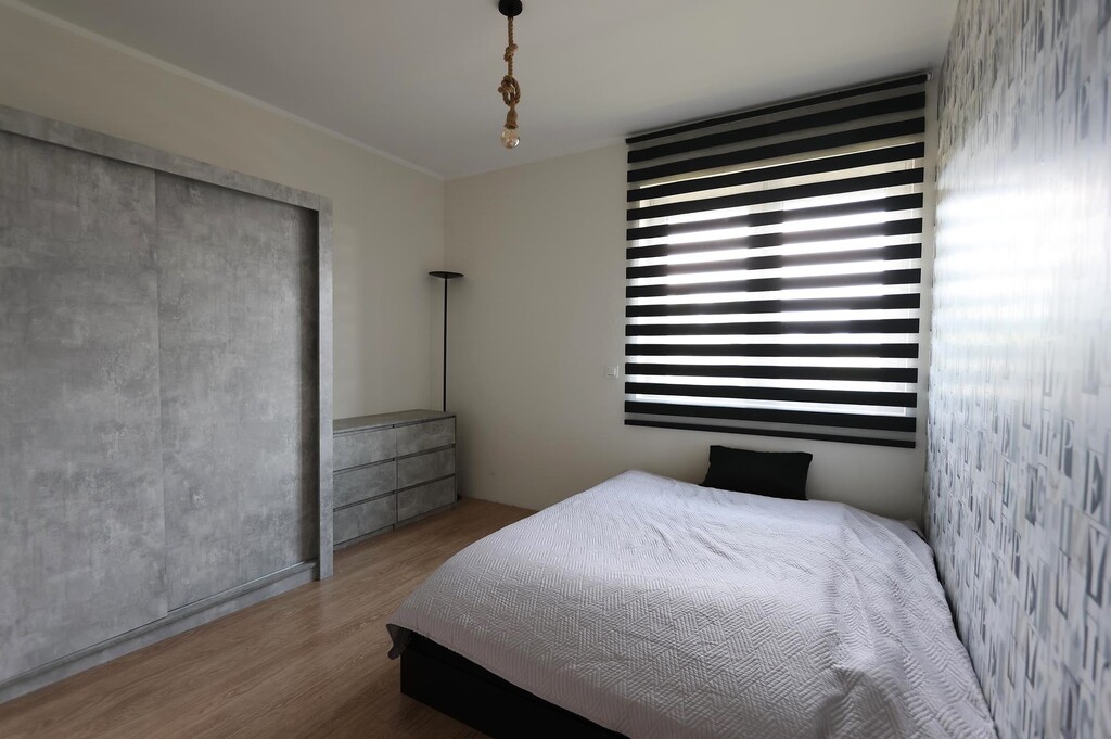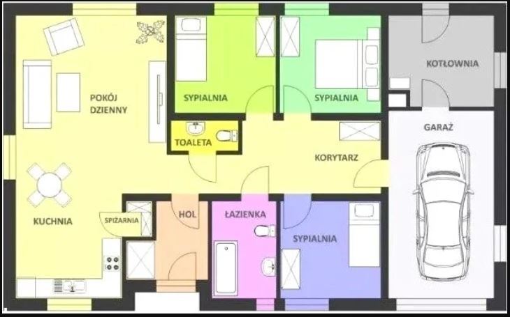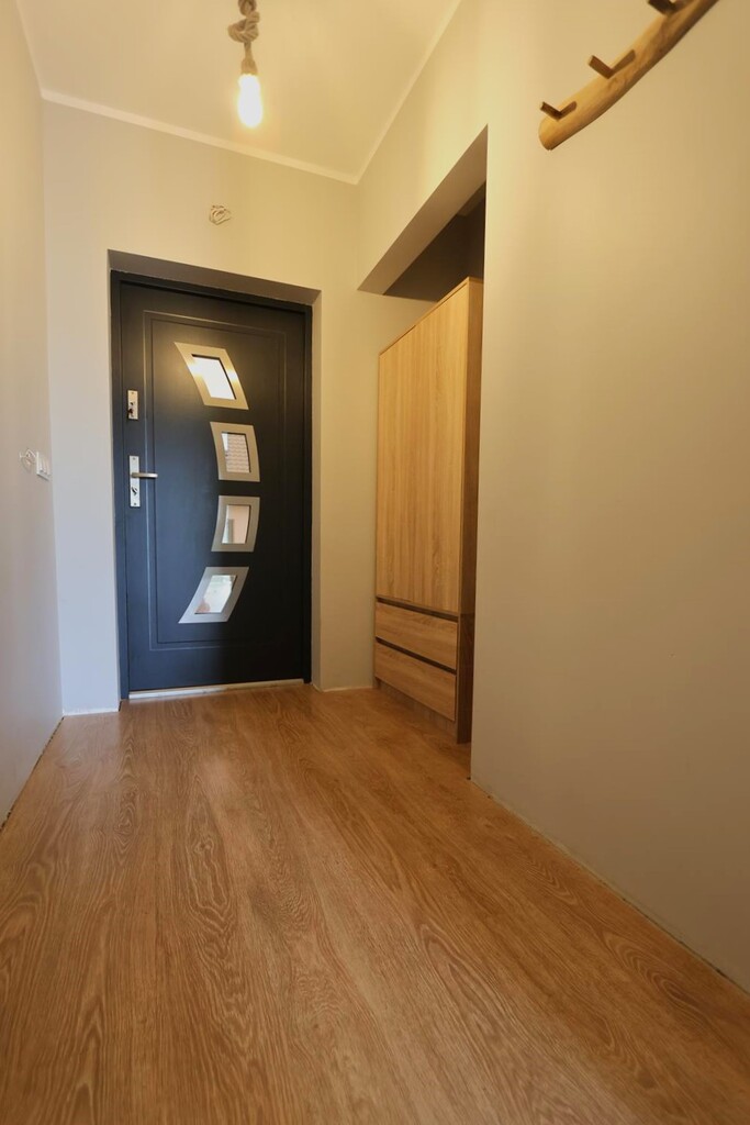 Wnętrze domu obejmuje przestronny salon z otwartą kuchnią, trzy ustawne sypialnie, dużą łazienkę z oknem, osobne WC oraz garaż i kotłownię w bryle budynku. Dom jest niemal w pełni wykończony – na podłogach panele, ściany gładzone i malowane, w pokojach częściowo tapeta. Kuchnia jest umeblowana i wyposażona w sprzęt AGD taki jak lodówka, zmywarka, płyta indukcyjna, okap – wszystko to pozostaje w cenie. W łazience znajduje się prysznic, kompakt WC, umywalka, pralka oraz dodatkowy grzejnik drabinkowy.
