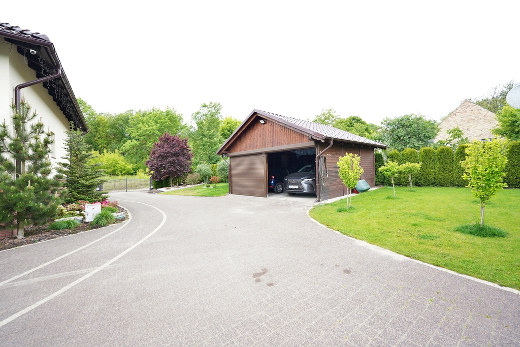 kamienna piwniczka, budynki gospodarcze i wolno stojące dwa duże garaże.