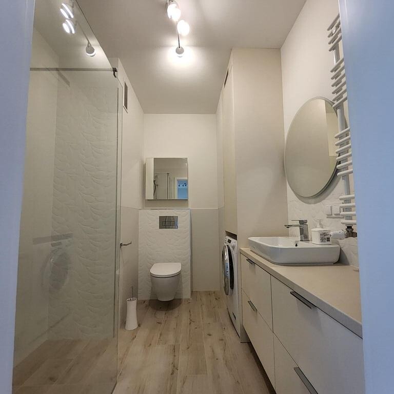 łazienka z WC (ok. 5 m²), wyposażona w prysznic, umywalkę, grzejnik drabinkowy,
