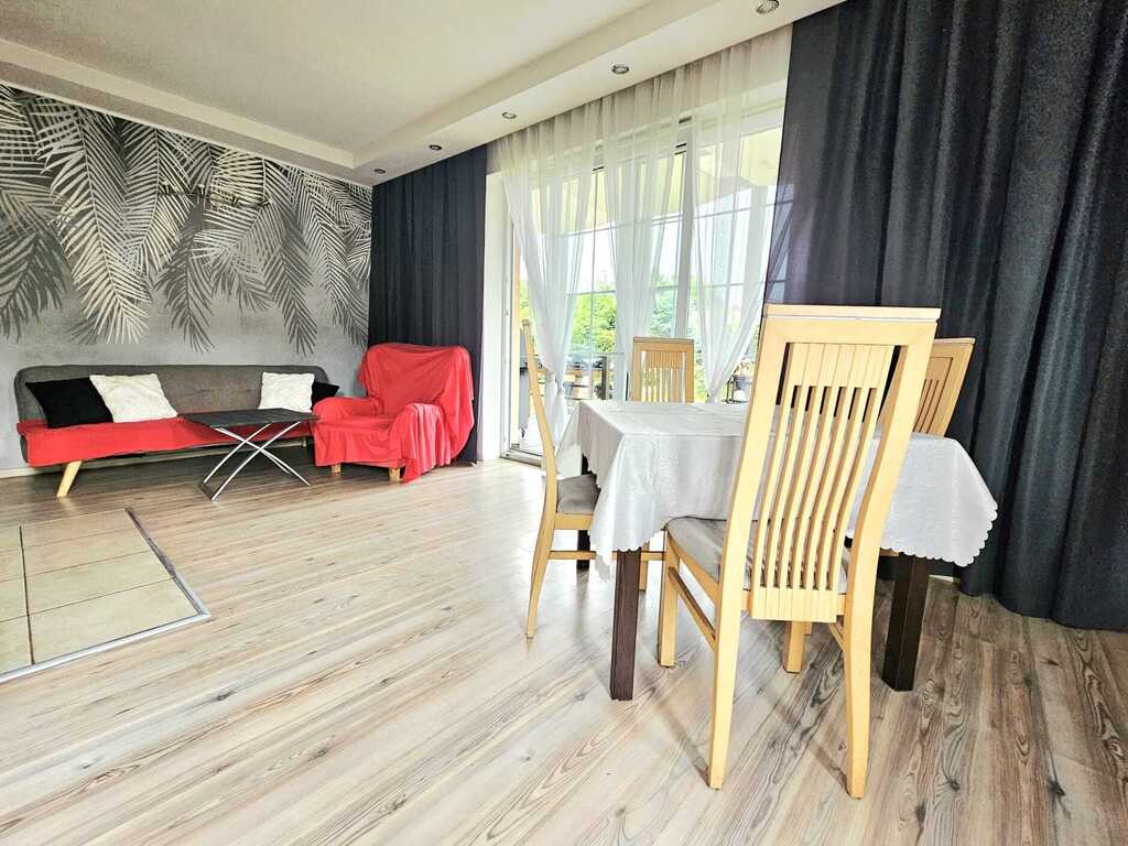 Na powierzchnię parteru budynku (98,57m2), pełniącego jednocześnie rolę strefy dziennej domu, składają się: przestronny salon z jadalnią, z którego wychodzimy na zaaranżowany taras i duży ogród, otwarta - widna kuchnia z oknem, 2 sypialnie, łazienka z wc, pomieszczenie sanitarne z bezpośrednim wejściem do garażu (jednostanowiskowy, z bramą otwieraną na pilota), znajdującego się w bryle budynku. Na piętro nieruchomości prowadzą piękne, drewniane schody. W górnej części nieruchomości (33,55m2), stanowiącą strefą nocną domu, zastaniemy sypialnie z garderobą, pokój hobby, pomieszczenie gospodarcze oraz główną łazienkę (z kabiną prysznicową i wanną).