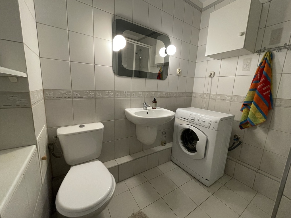 Łazienka z prysznicem i pralką.
