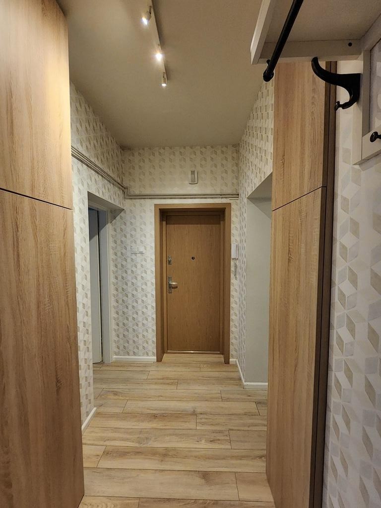 W lokalu znajduje się wiele stałych zabudów, dzięki czemu udało się bardzo dobrze zagospodarować całą przestrzeń i otrzymać dużo powierzchni do przechowywania. Na podłodze położono panele, ściany malowane i tapetowane.