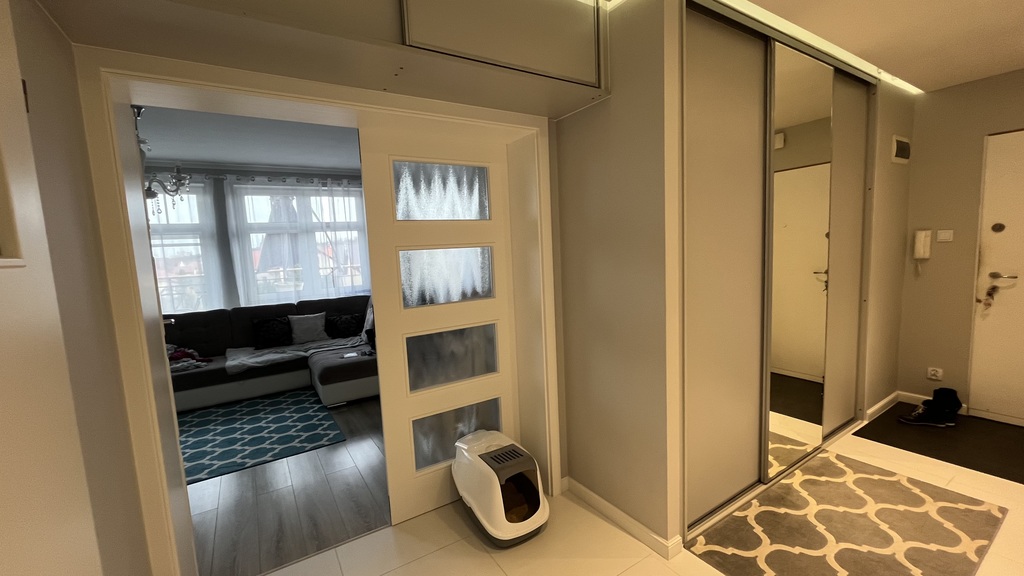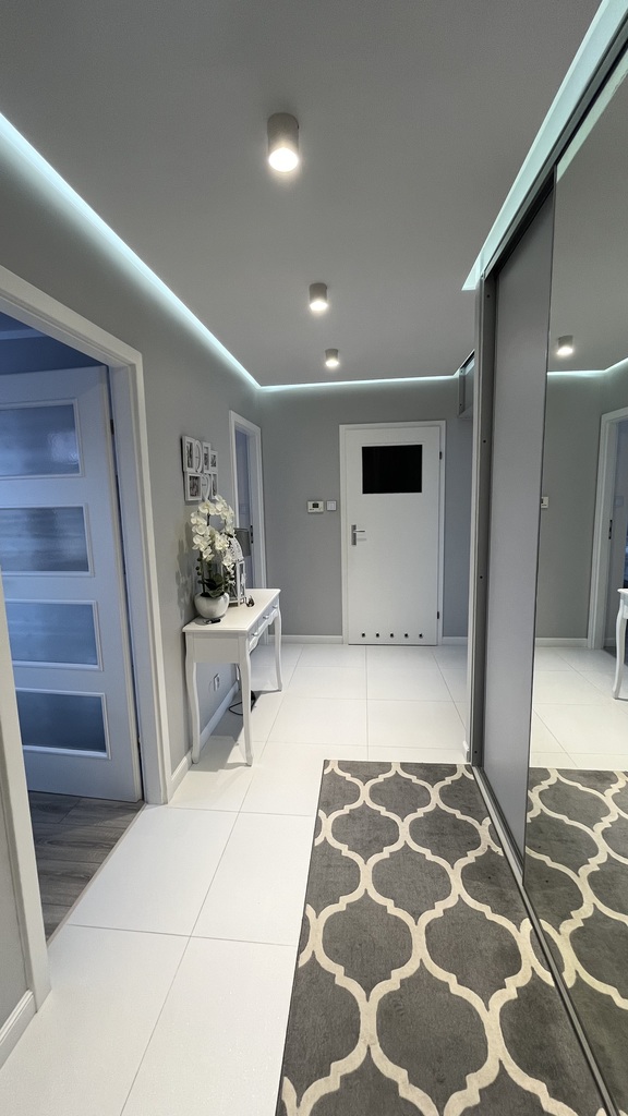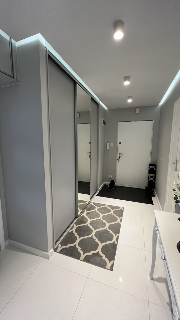 Przedpokój przestronny z wbudowaną dużą szafą typu komandor.