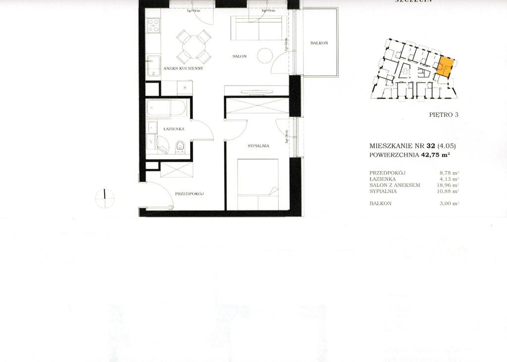OPIS MIESZKANIA: mieszkanie 2 pokojowe o powierzchni 42,75 m2, z wyjściem na balkon o powierzchni 3 m2. Pokój z aneksem kuchennym o powierzchni 18,96 m2, sypialnia 10,88 m2, łazienka 4,13 m2, przedpokój 8,78 m2. Balkon od strony wschodniej o powierzchni 3 m2. III piętro w V piętrowym budynku z windą. Wystawa okien północno - wschodnia.