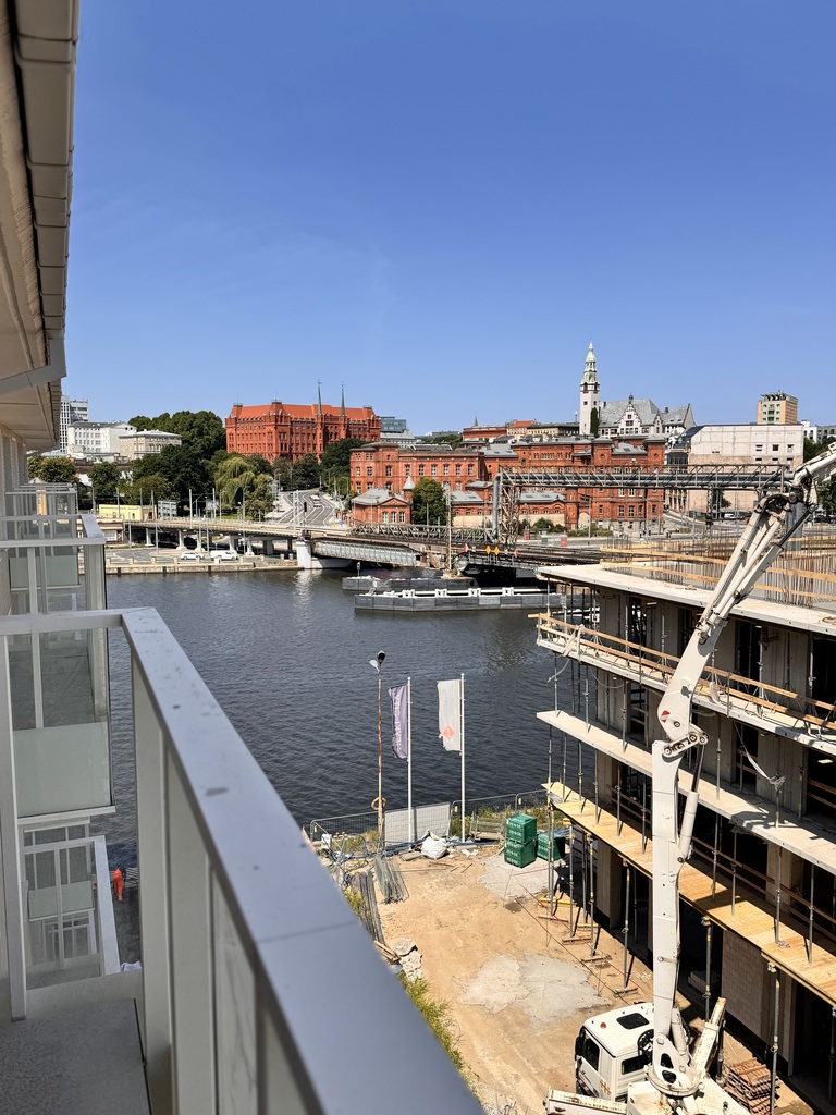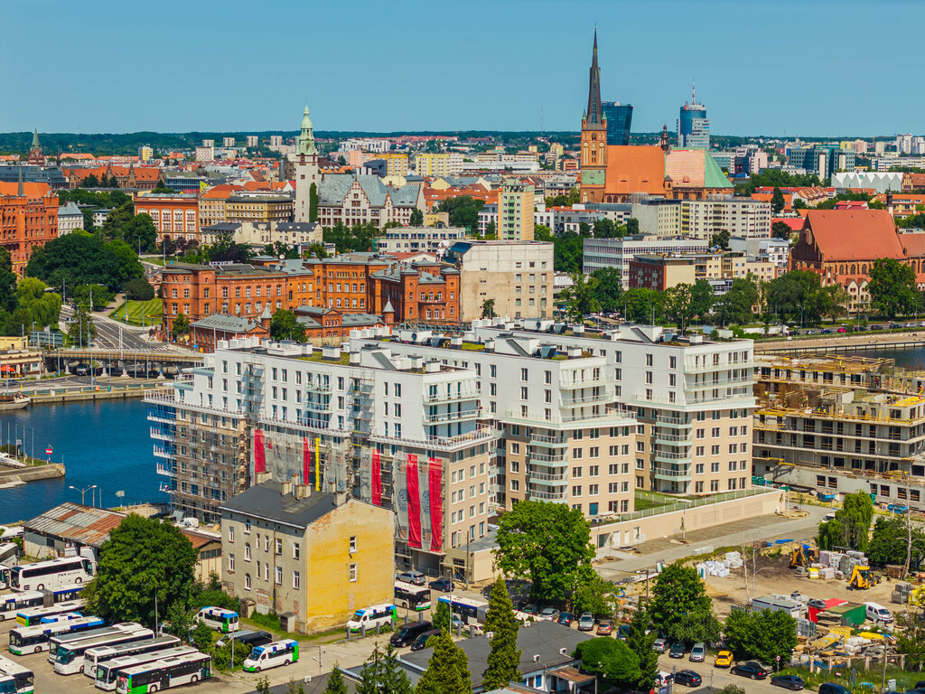 Klienci dzięki balkonom i dużym przeszkleniom mogą delektować się widokiem na rzekę i panoramę Szczecina.