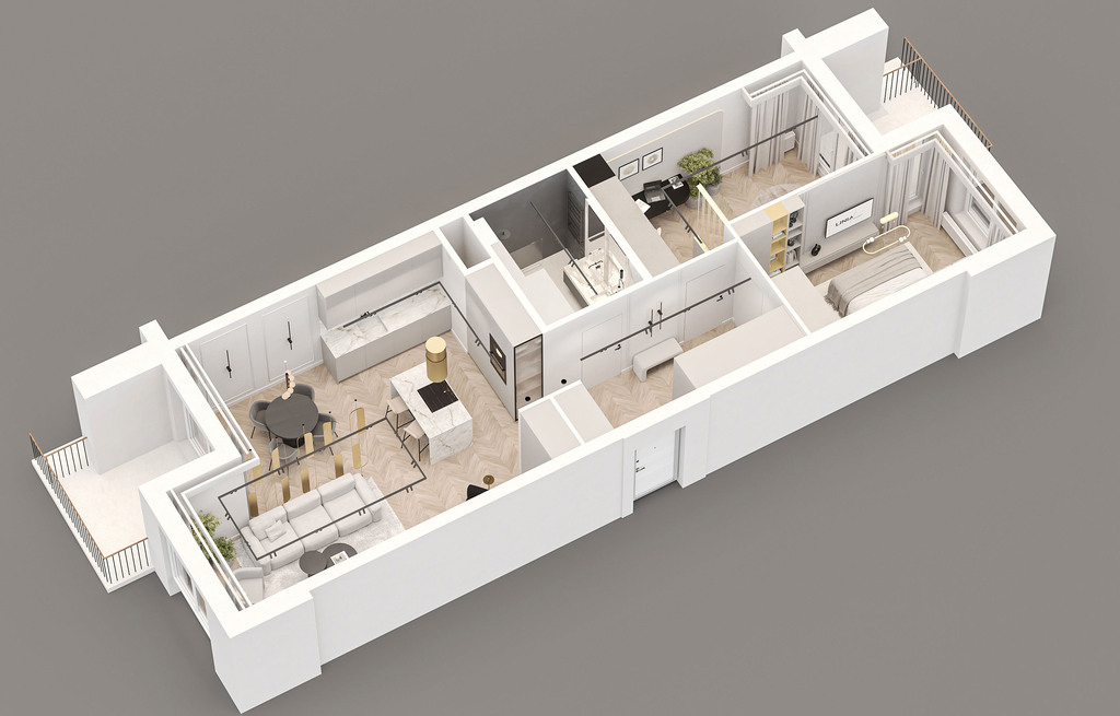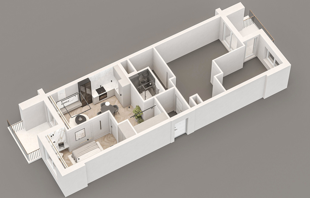 Uzyskujemy wówczas dwa mieszkania dwupokojowe o metrażach ok. 37 m2, obydwa z balkonami.