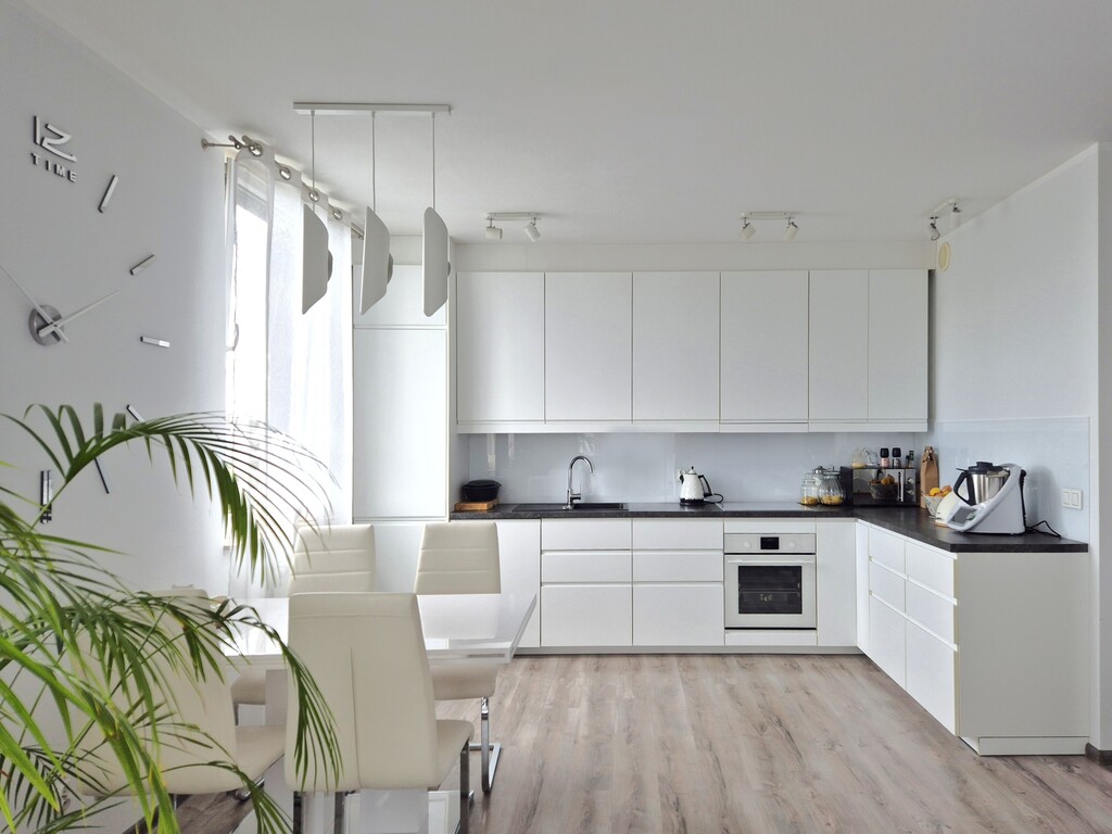 * salon z otwartą kuchnią; meble kuchenne na wymiar, sprzęt AGD – płyta indukcyjna w białym kolorze, piekarnik, lodówka i zmywarka w zabudowie