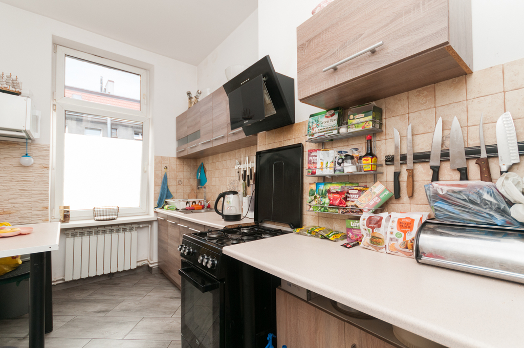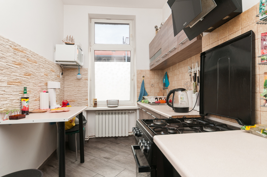 Trzeci pokój od strony podwórza. Kuchnia widna z meblami kuchennymi i sprzętem AGD w cenie. Łazienka również z oknem, w glazurze i terakocie, kabina prysznicowa z odpływem w posadzce.