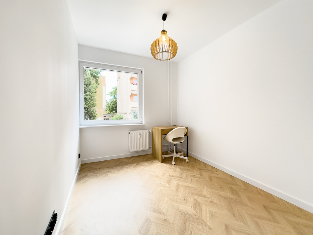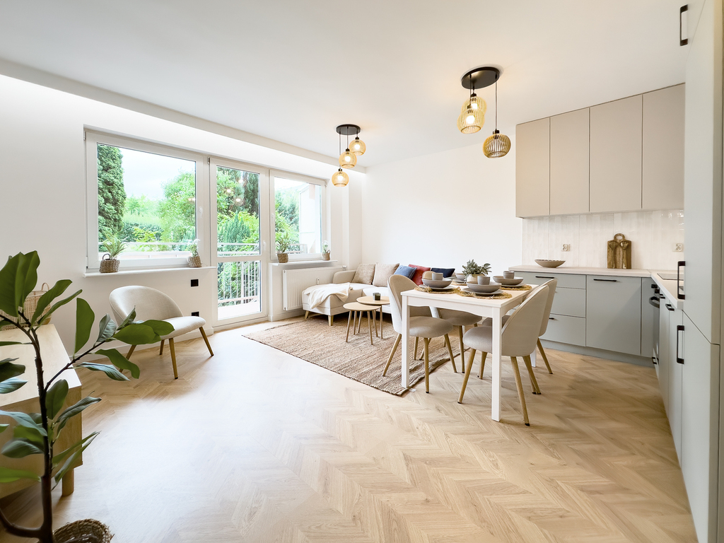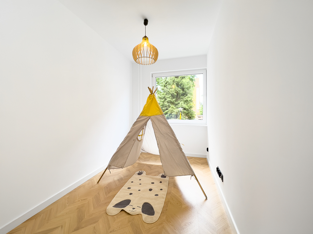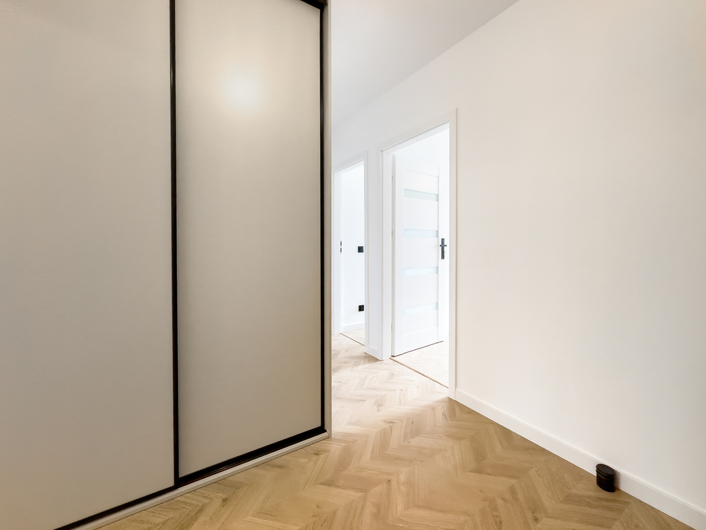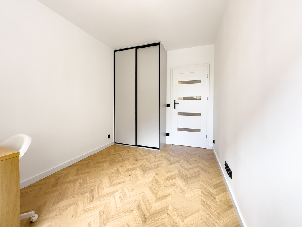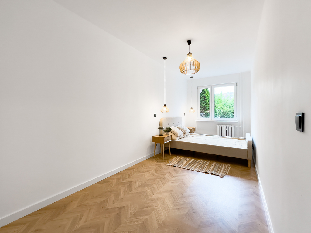 Mieszanie o funkcjonalnym układzie wnętrza. Salon z aneksem kuchennym z wyjściem na loggię i zejściem do ogródka położonego od strony południowej. Trzy ustawne sypialnie, w dwóch szafy typu Komandor. Aneks kuchenny z meblami w zabudowie stolarskiej na wymiar ze sprzętem AGD ( lodówka z zamrażalnikiem, zmywarka, płyta indukcyjna, piekarnik, okap). Łazienka razem z WC z wanną i parawanem wykończona nowoczesnym gresem. Oddzielne pomieszczenie pralni. Przedpokój szafą na wymiar i szafką z lustrem. W cenie zabudowy stałe oraz sprzęt AGD.