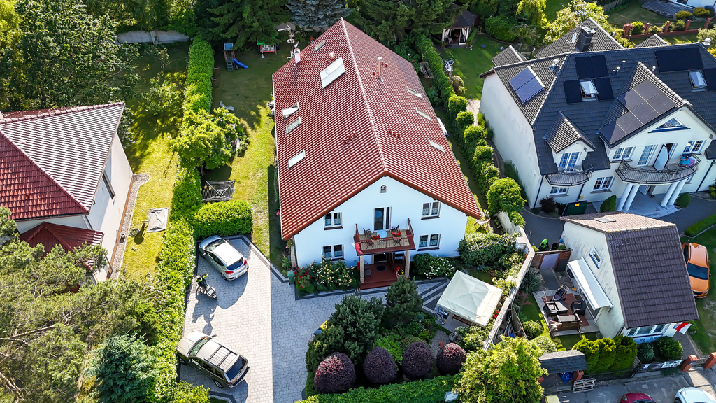 Dom posadowiony na płaskiej, zagospodarowanej działce o powierzchni 1 107 m2.