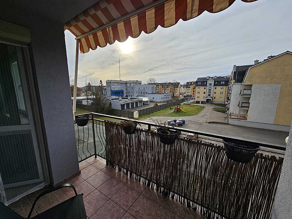 Z salonu jest wyjście na przestronny balkon wyposażony w zamontowaną markizę chroniącą latem przed słońcem.