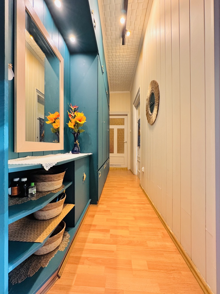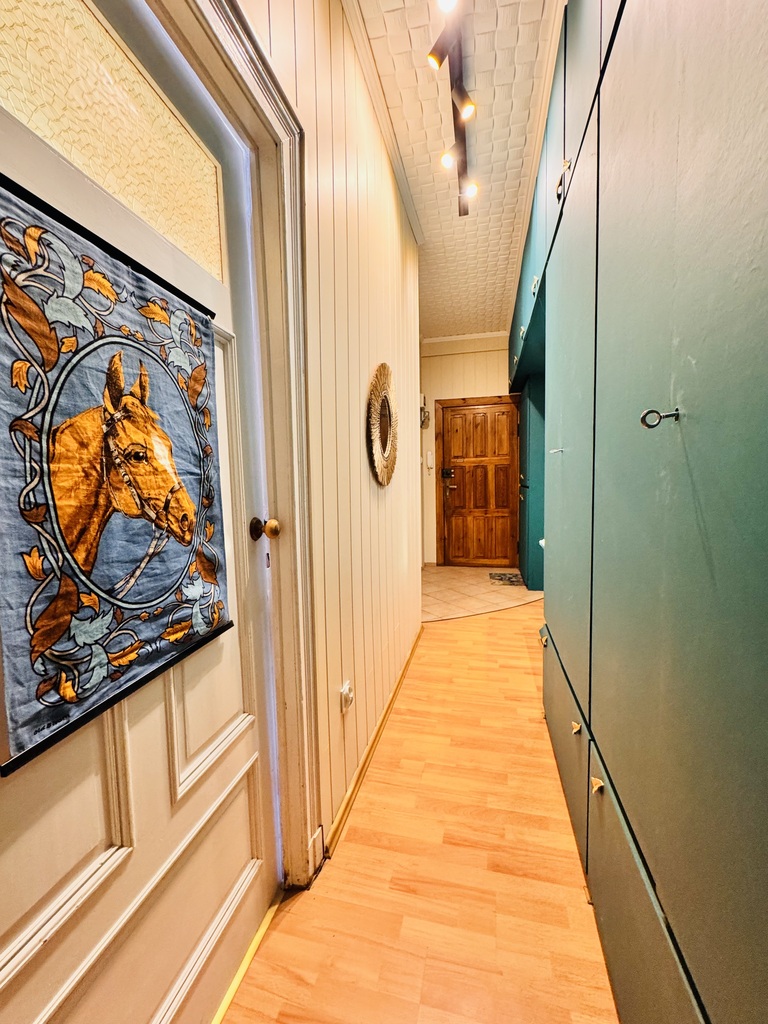 - korytarz z szafami w zabudowie.