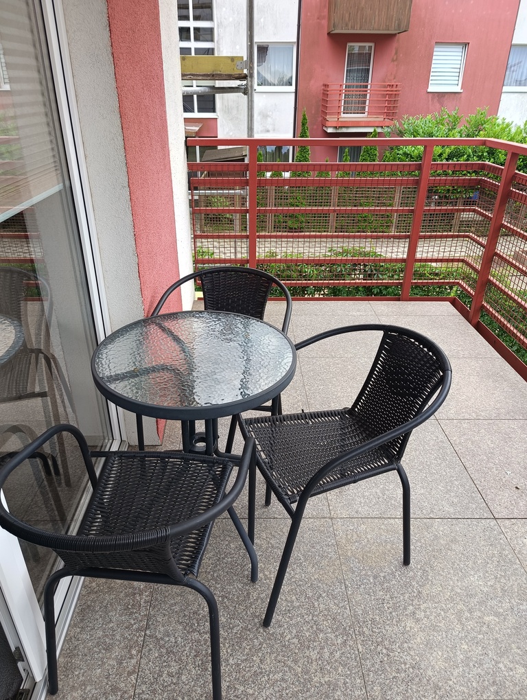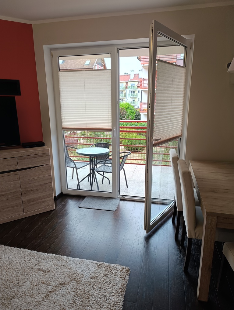 • przestronny salon z otwartą kuchnią w pełni umeblowaną i wyposażoną w sprzęt AGD, z którego prowadzi wyjście na duży, słoneczny balkon,