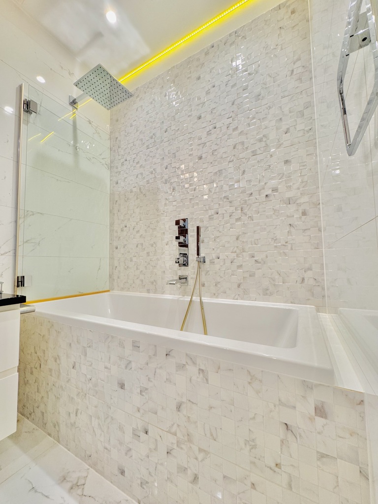Łazienka (ok. 6 m2) razem z umywalką, WC i wanną z prysznicem.