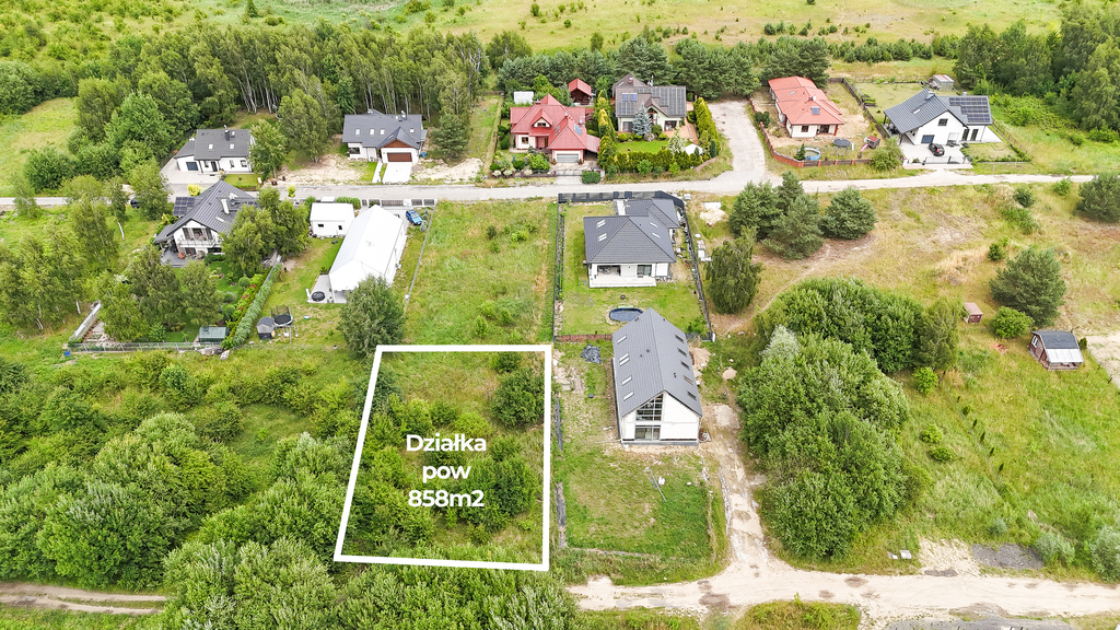 Działka płaska, w kształcie prostokąta, o powierzchni 858 m2.