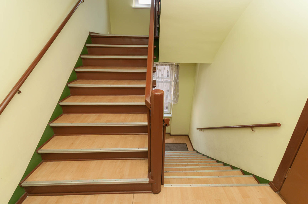 Odnowiona kamienica oraz klatka schodowa.