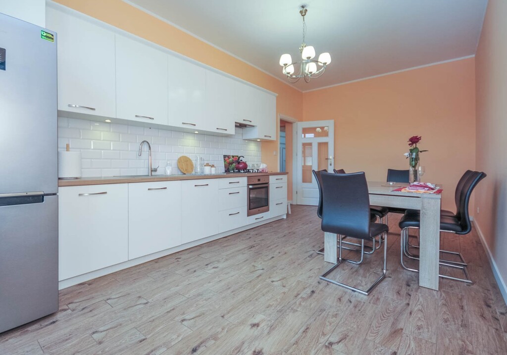- kuchni wyposażonej w meble kuchenne, zmywarkę , piekarnik , lodówkę, zamrażarkę, płytę gazową oraz stół jadalniany z krzesłami