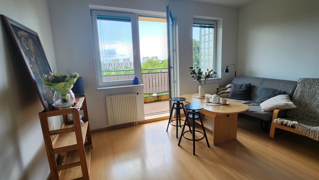 Duży przestronny pokój połączony z aneksem kuchennym. Z pokoju wyjście na klasyczny balkon, który ciągnie się po całej szerokości.