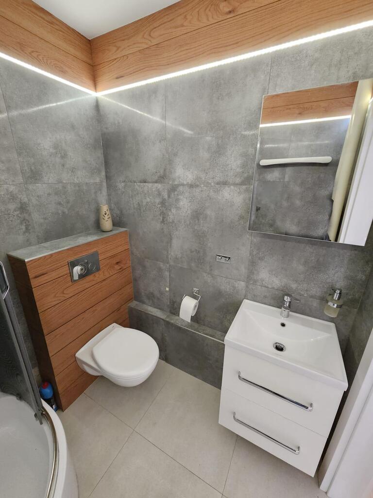 nową aranżację łazienki, całkowite odnowienie kuchni: nowe meble kuchenne oraz nowoczesny sprzęt AGD, montaż nowych drzwi wejściowych. Zrezygnowano z gazu (zainstalowano kuchenkę indukcyjną). Całe wnętrze zostało odmalowane i odświeżone. Okna pcv.