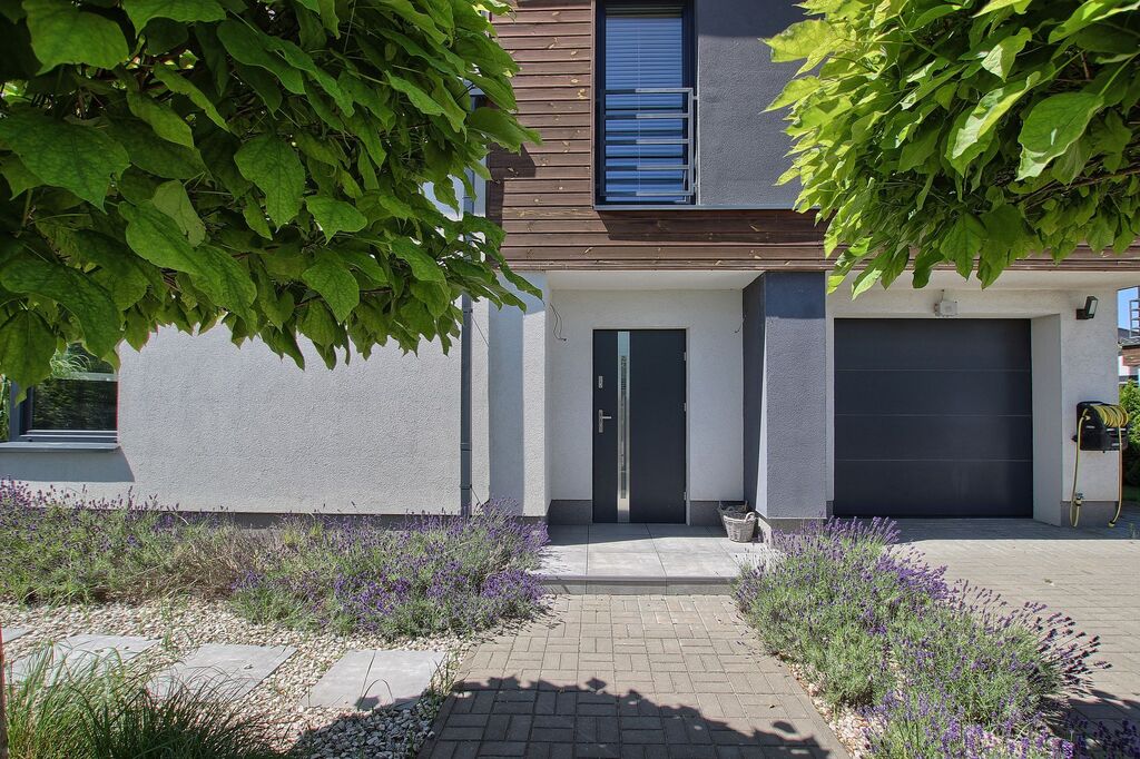 W bryle budynku znajduje się jednostanowiskowy garaż oraz pomieszczenie gospodarcze z pralką i suszarką.