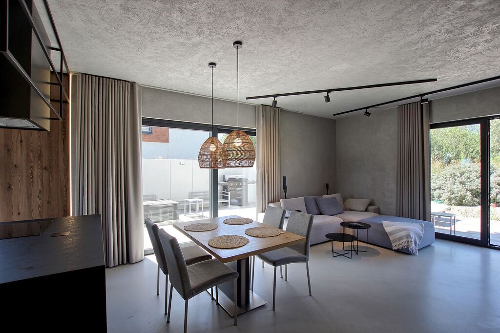 Pod sterowanym pilotem zadaszeniem znajduje się duży stół i krzesła.