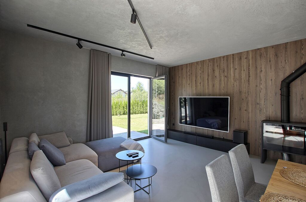 W salonie zainstalowano kino domowe. Z salonu wyjście na taras i do ogrodu.