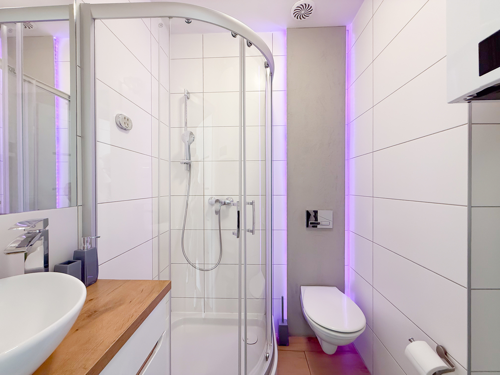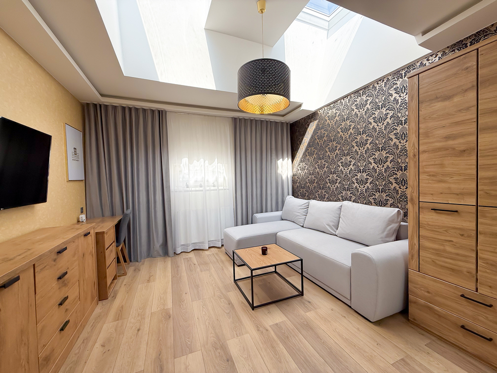 Przytulna przestrzeń o powierzchni 20,63 m2, na którą składa się: pokój, łazienka i przedpokój z aneksem kuchennym.