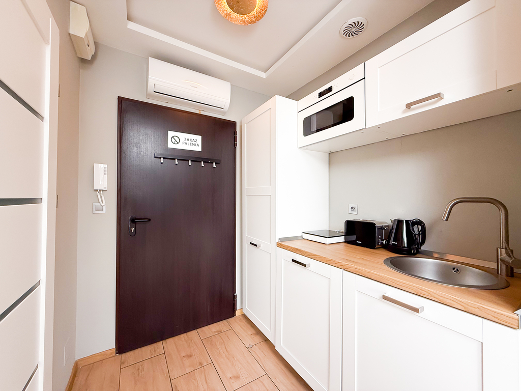 W mieszkaniu znajduje się klimatyzacja, telewizor, pralka, płyta grzewcza, mikrofalówka, lodówka, czajnik i toster.