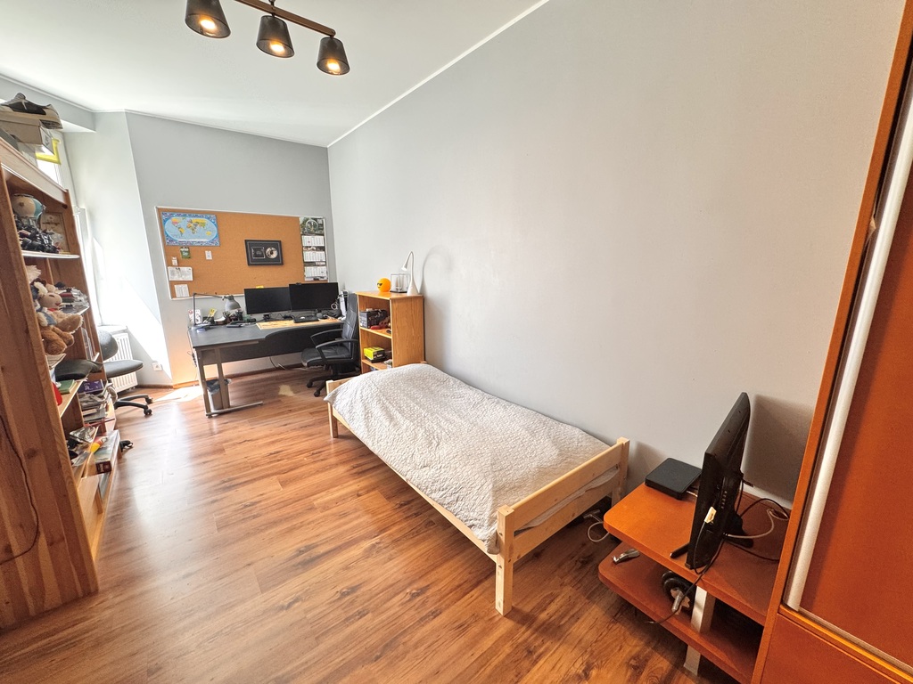 Na powierzchnię użytkową mieszkania wchodzi: salon (ok. 25 m2), sypialnia (ok. 20 m2), pokój (ok. 18 m2), kuchnia (ok. 12 m2), pomieszczenie gospodarcze (ok. 1 m2), łazienka (ok. 7 m2), korytarz (ok. 9 m2).