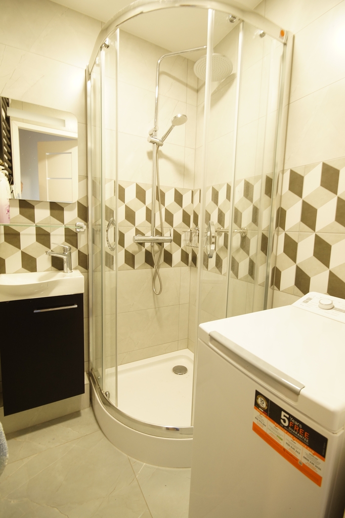 * łazienka po generalnym remoncie – nowoczesna kabina prysznicowa, umywalka, pralka i duże lustro,