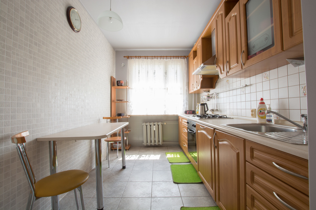 W mieszkaniu łazienka, WC, duża kuchnia wyposażona w sprzęt AGD.