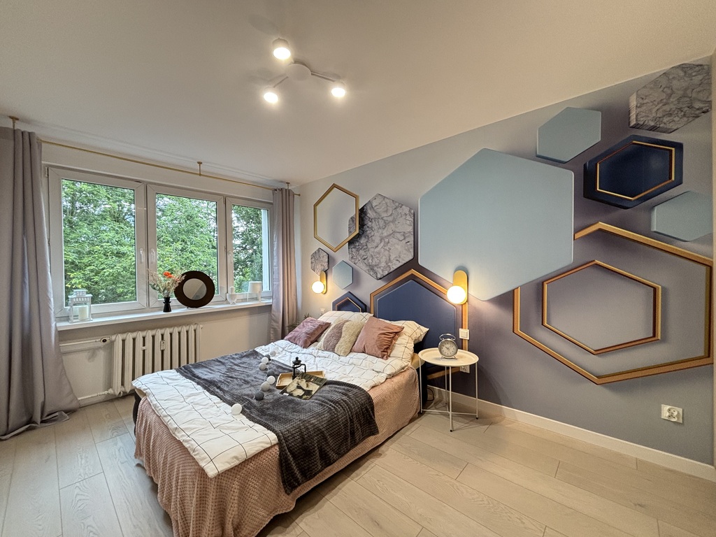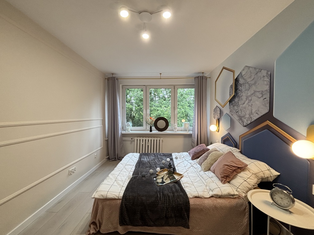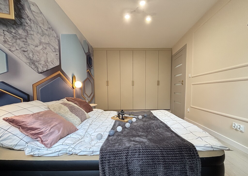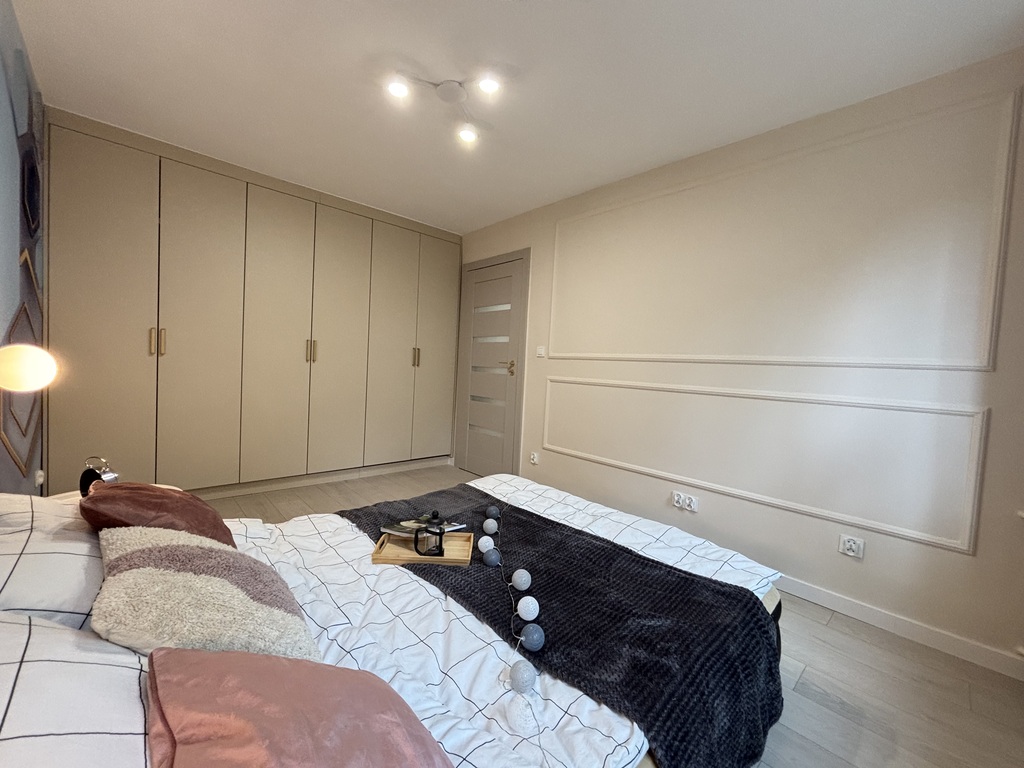 W sypialni na podłodze panele, ściany w gładzi ze sztukaterią i ozdobną tapetą. Na wyposażeniu bardzo duża szafa robiona przez stolarza.