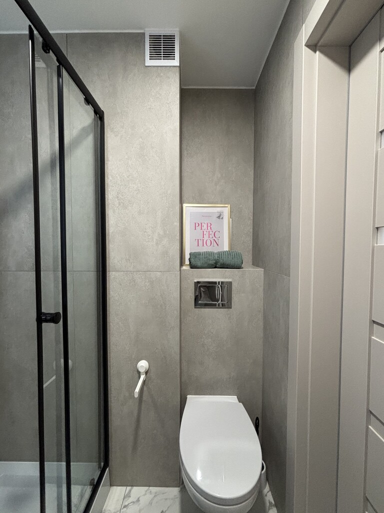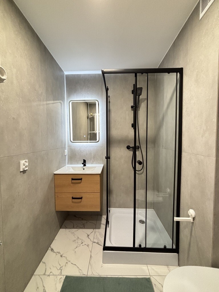 Łazienka z toaletą, wykończona gresem. Na wyposażeniu kabina prysznicowa, umywalka, szafka, grzejnik.
