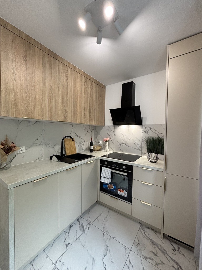 Kuchnia oddzielna z oknem. Meble na wymiar robione przez stolarza. Na wyposażeniu pełne AGD nowe na gwarancji (zmywarka, okap, płyta ceramiczna, lodówka).