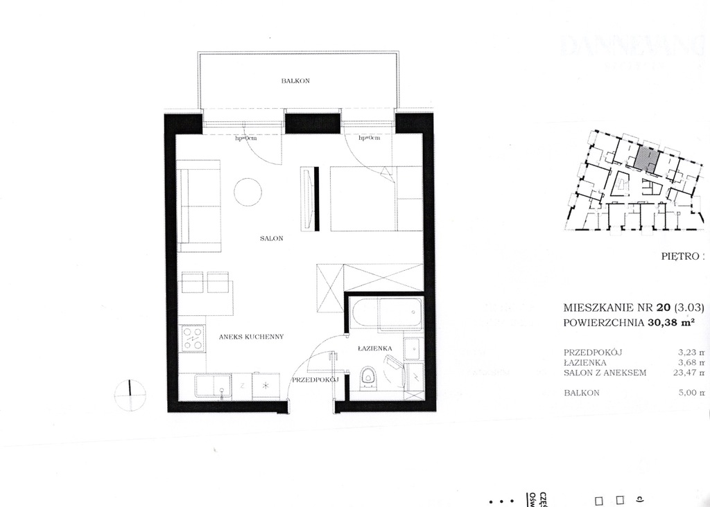 OPIS MIESZKANIA: mieszkanie 1 pokojowe o powierzchni 30,38 m2, z wyjściem na balkon o powierzchni 5 m2. Pokój z aneksem kuchennym o powierzchni 23,47 m2, łazienka 3,68 m2, przedpokój 3,23 m2. Balkon od strony północnej o powierzchni 5 m2. II piętro w V piętrowym budynku z windą. Wystawa okien północno - wschodnia.