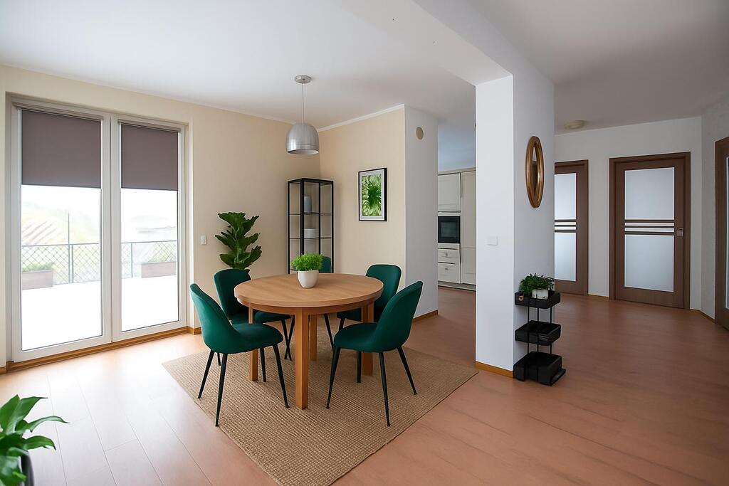 Salon połączony z jadalnią, tworzący otwartą przestrzeń. W salonie, korytarzu oraz w kuchni wymieniona podłoga.