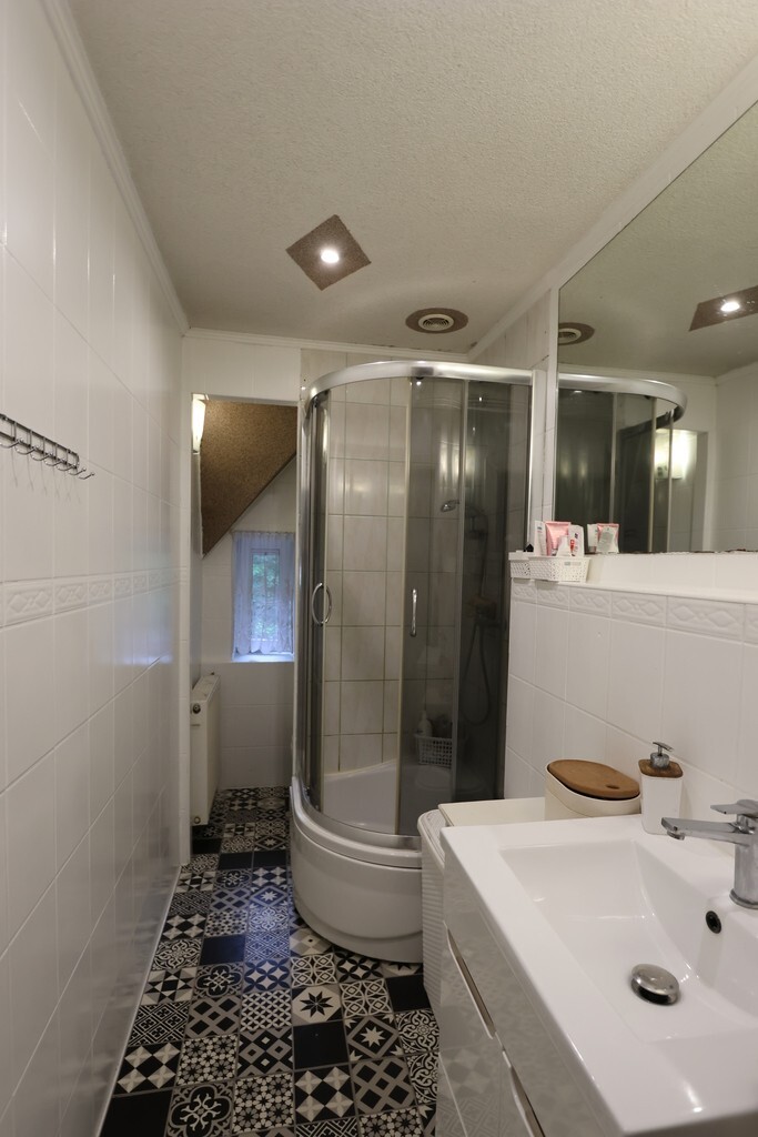 - łazienka - odświeżone, pomalowane płytki, na podłodze panele winylowe, kabina prysznicowa, toaleta, piec vaillant do grzania wody.
