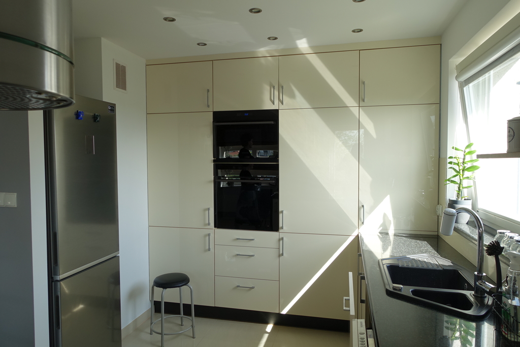 Kuchnia otwarta na salon, w zabudowie kuchennej wraz ze sprzętem AGD/ zmywarka Siemens, piekarnik, lodówka, mikrowella firmy Samsung, pochłaniacz Arset /.