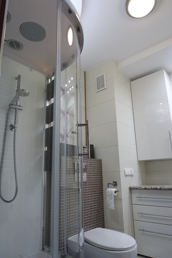 Łazienka z wc w glazurze i terakocie, z kabiną prysznicową.